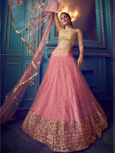 गुलाबी भारी कढ़ाई नेट लेहेंगा