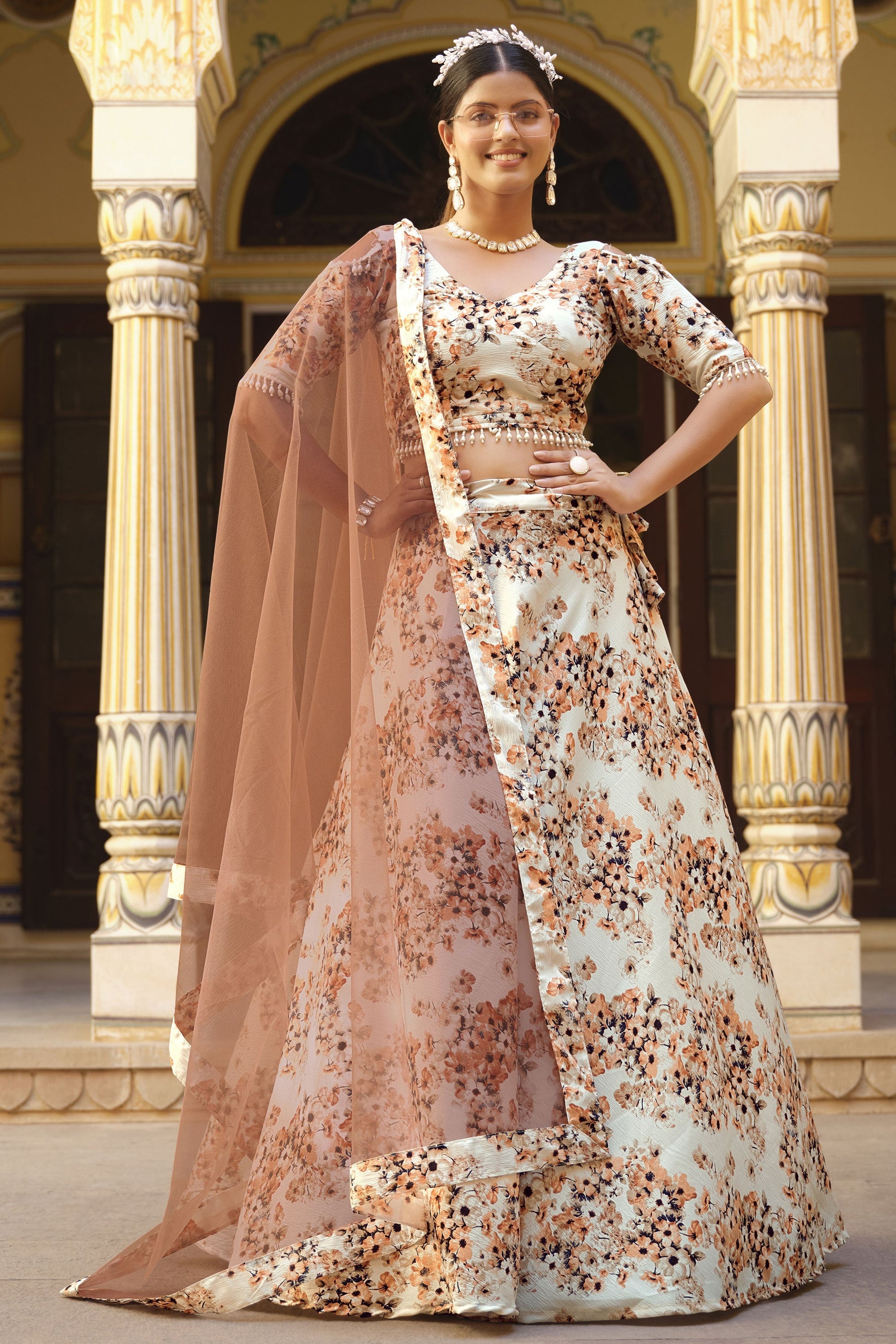 आर्ट सिल्क फैब्रिक में प्रिंटेड बेज कलर संगीत वियर लहंगा चोली
