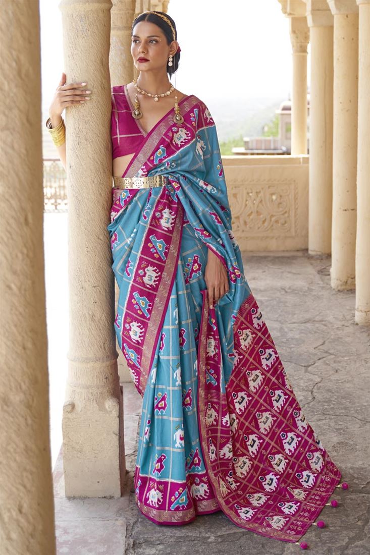 प्रिंटेड वर्क आर्ट सिल्क फ़ैब्रिक स्काई ब्लू कलर फंक्शन वियर अविश्वसनीय साड़ी