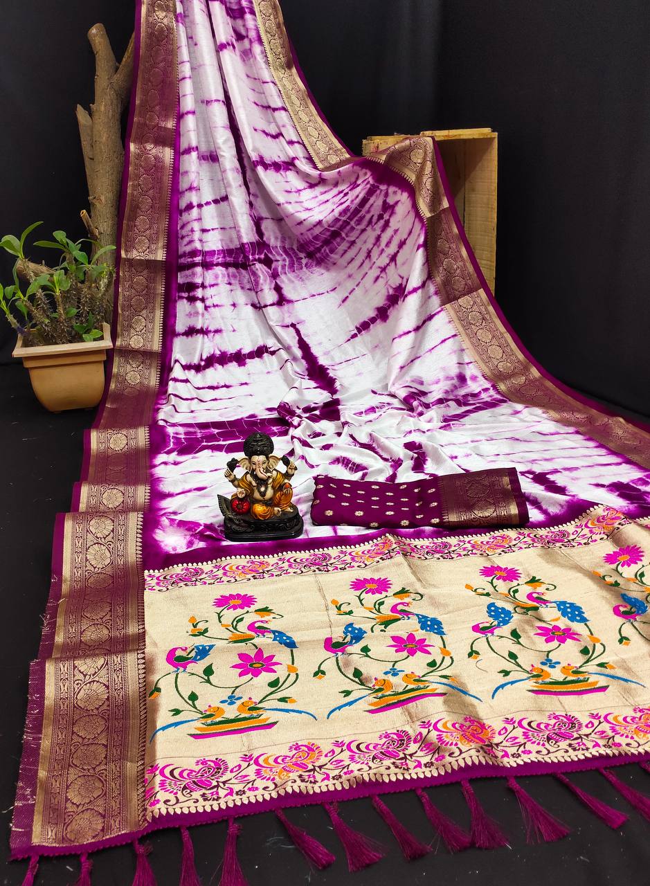 टेक्स्ट ब्लॉक बैंगनी रंग की खूबसूरत ओरिजिनल सिबोरी सॉफ्ट डोला सिल्क साड़ी के साथ