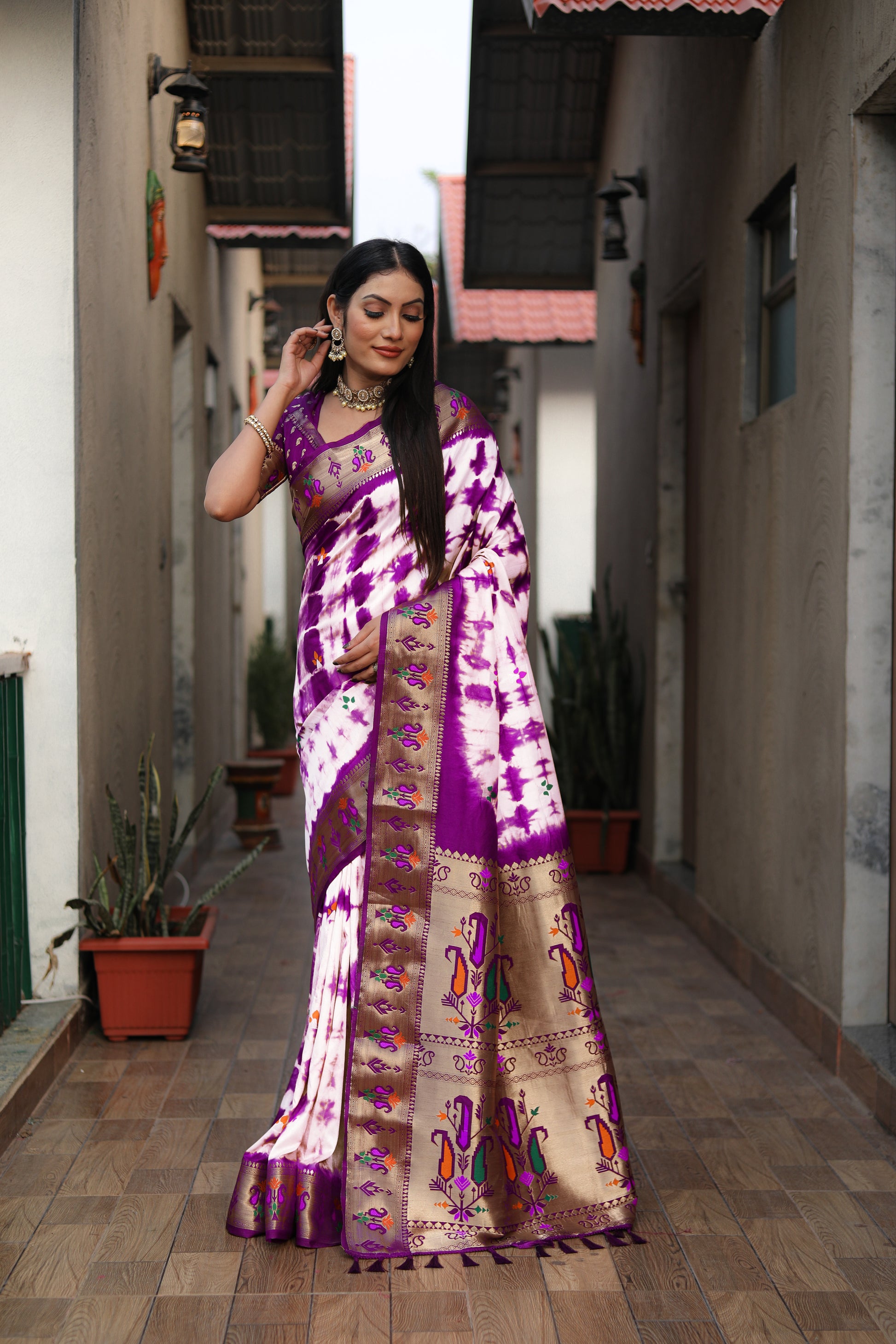 बैंगनी रंग विशेष सिबोरी प्रिंट पैठानी सिल्क साड़ी ज़री गोल्ड और मीनाकारी पैठानी बॉर्डर