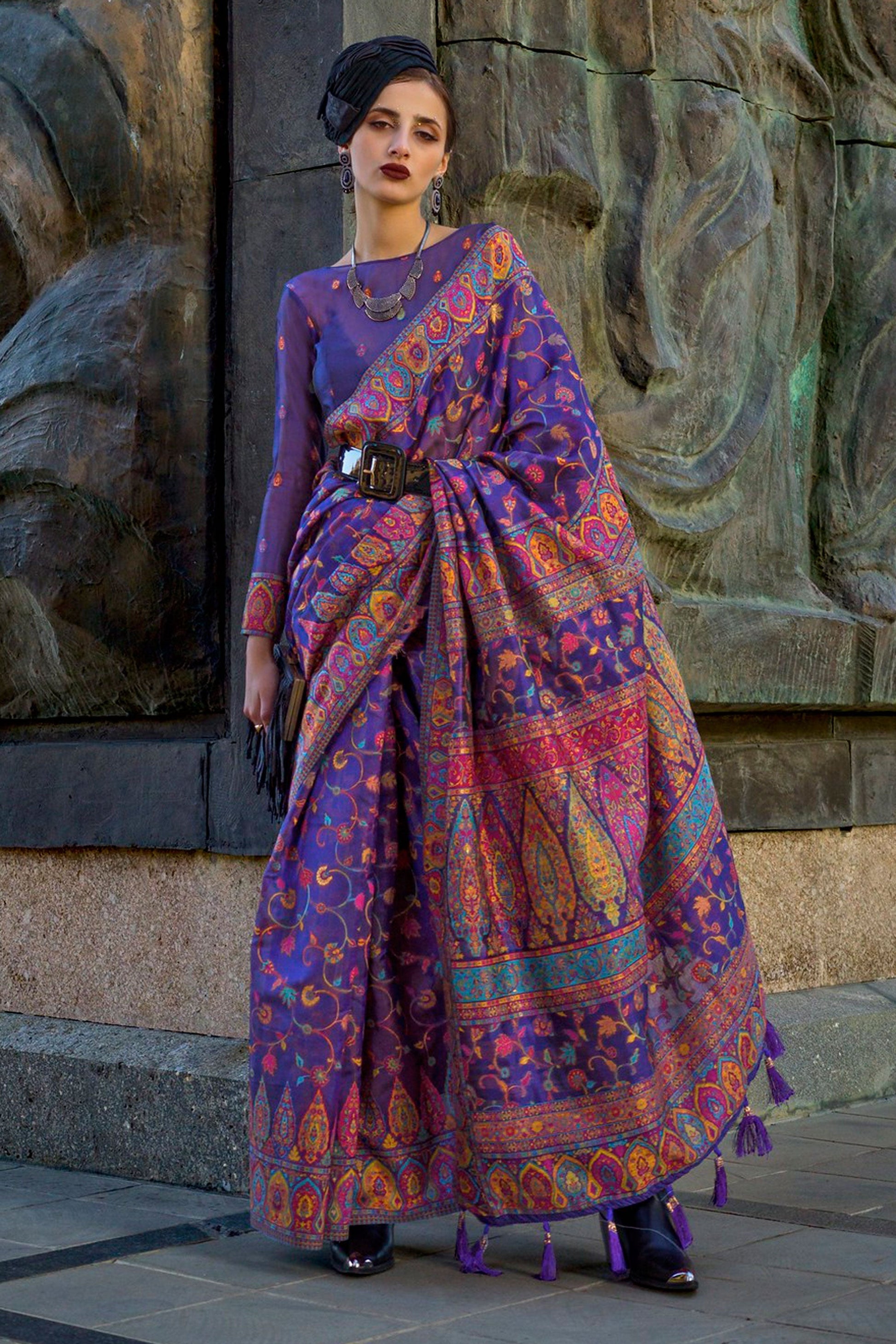 ऑर्गेंज़ा फ़ैब्रिक पर बैंगनी रंग की बुनाई का काम सुंदर साड़ी