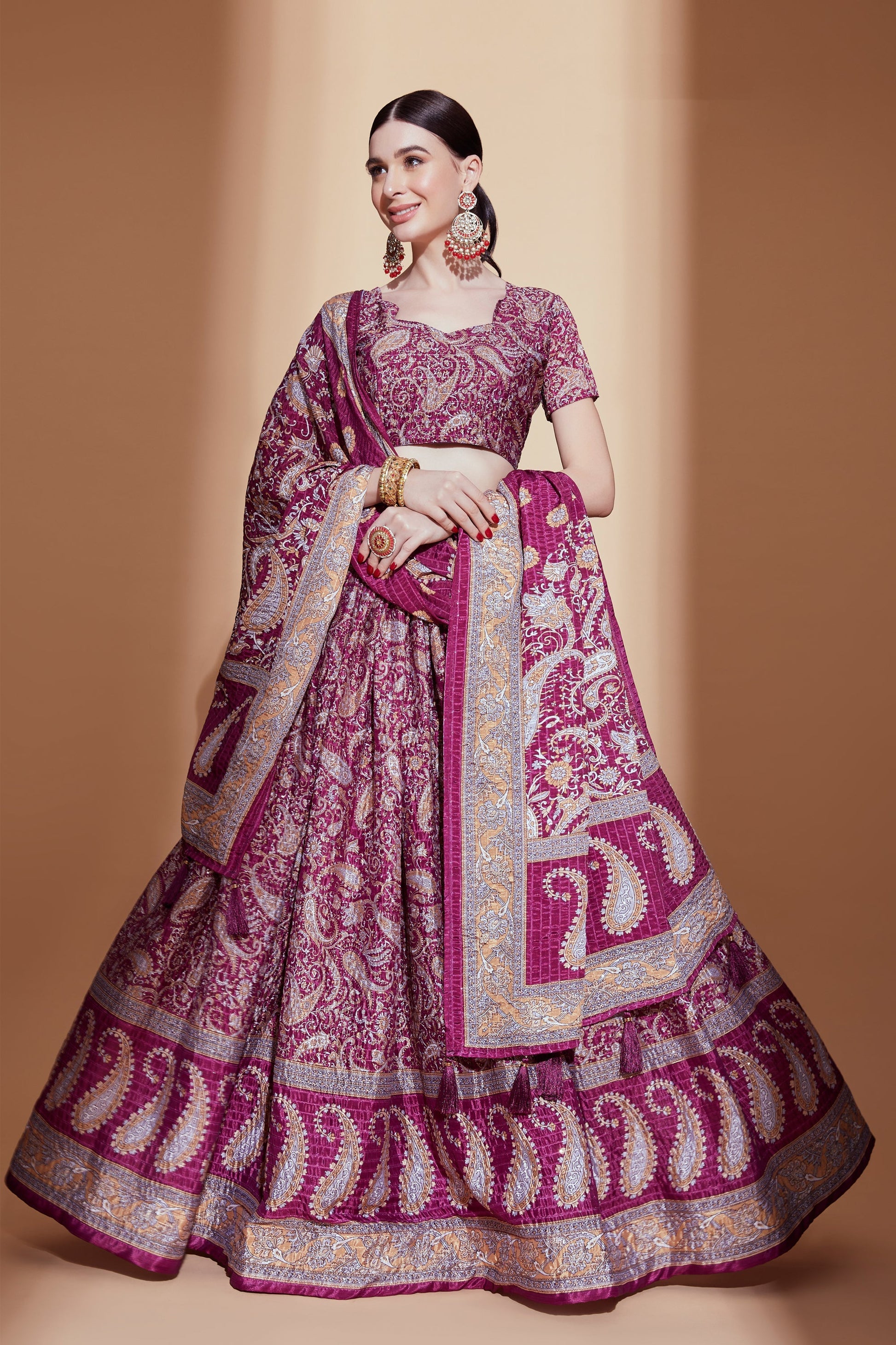 बैंगनी डिजिटल प्रिंट चिनॉन फैब्रिक रिसेप्शन वियर लेहेंगा चोली