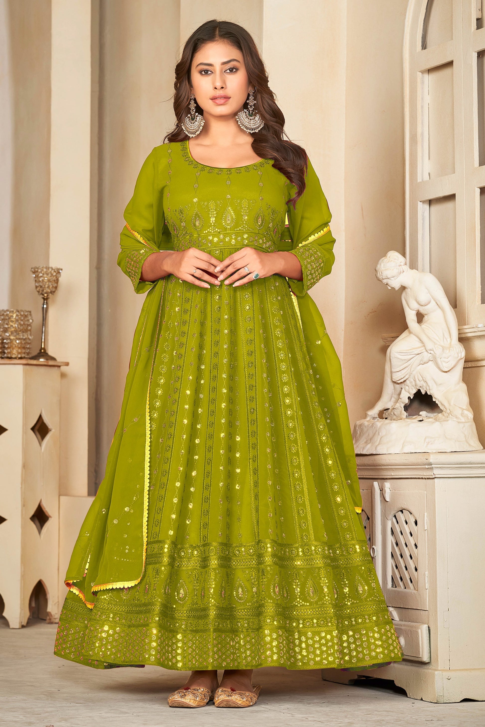 चमकदार हरे रंग का जॉर्जेट फ़ैब्रिक सेक्विन कढ़ाई वाला अनारकली सूट