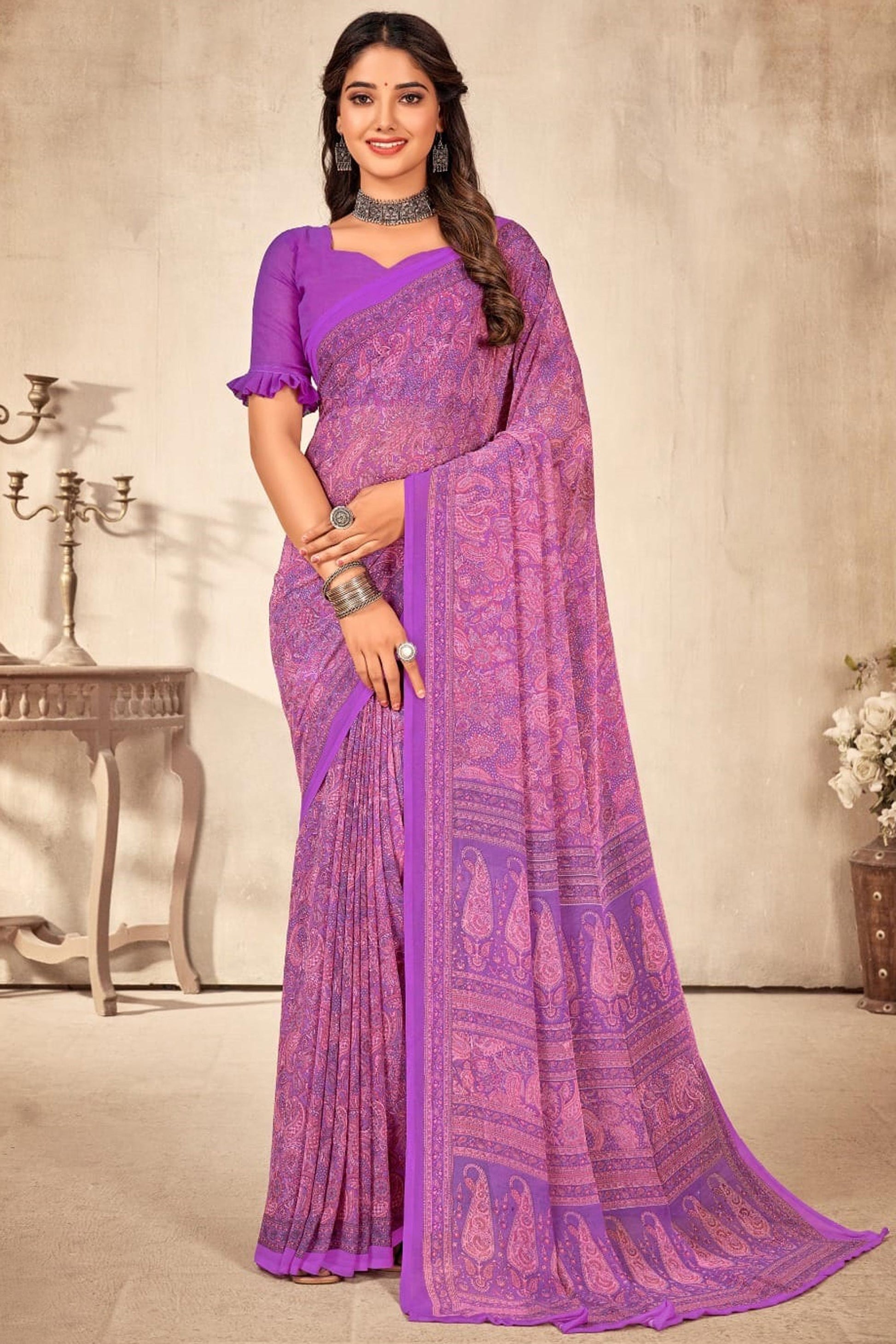 रेडियंट पर्पल कलर प्रिंटेड जॉर्जेट साड़ी