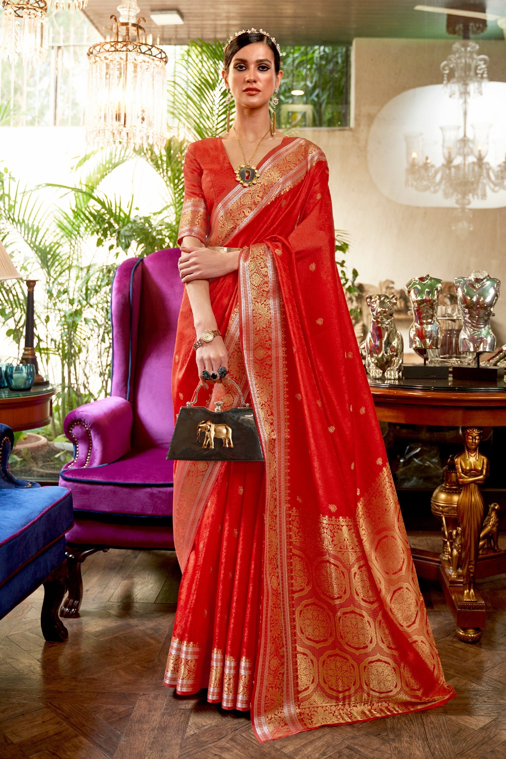 चमकदार लाल रंग की आर्ट सिल्क बुनाई साड़ी