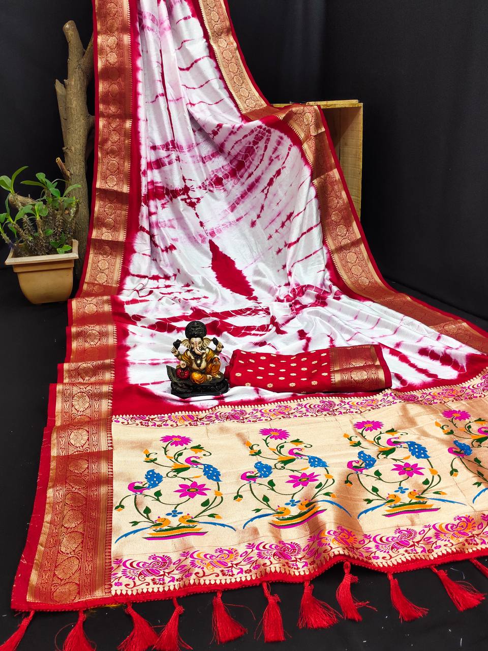 लाल रंग की खूबसूरत ओरिजिनल सिबोरी सॉफ्ट डोला सिल्क साड़ी के साथ