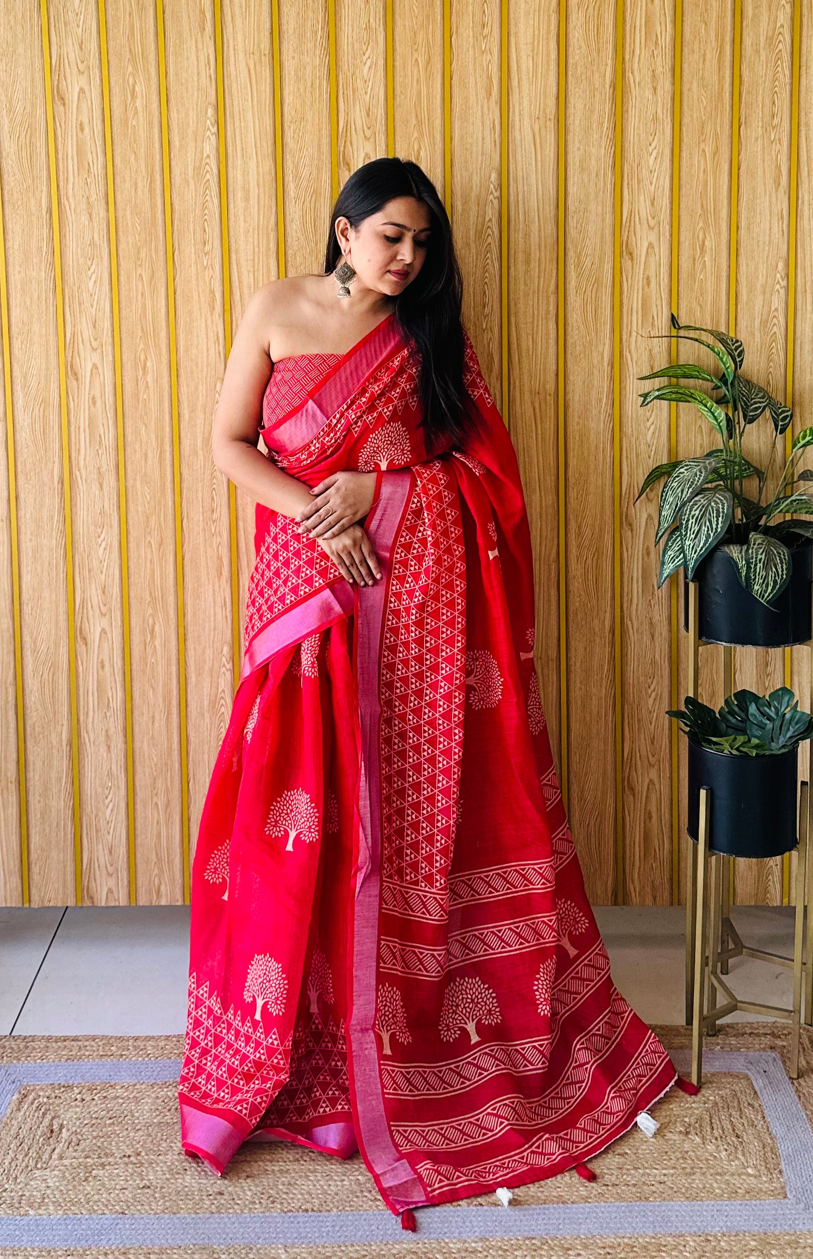टेक्स्ट ब्लॉक विशेष गुणवत्ता सुंदर लाल रंग नरम लिनन कपास डिजिटल प्रिंट साड़ी