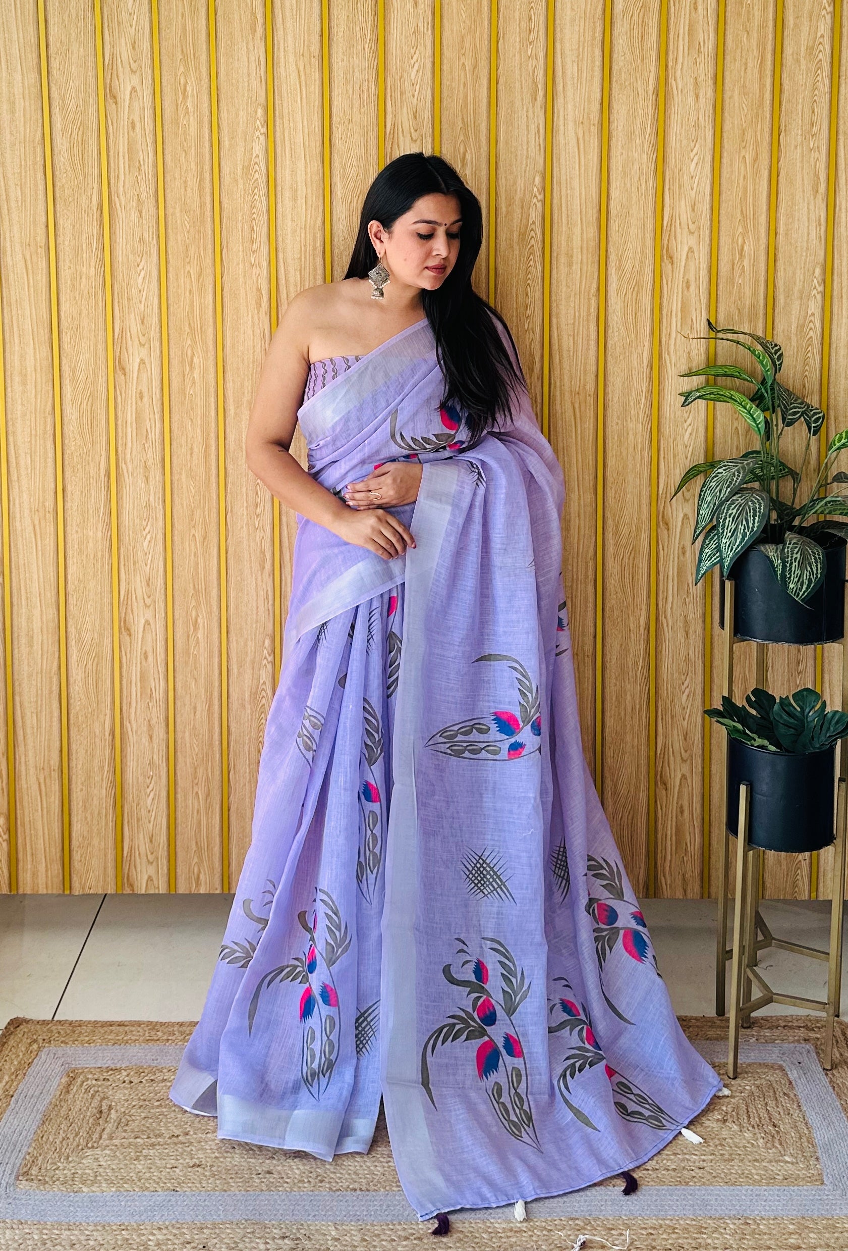 लाइट पर्पल एक्सक्लूसिव वेडिंग सॉफ्ट लिनन कॉटन डिजिटल प्रिंट साड़ी सिल्वर बॉर्डर के साथ