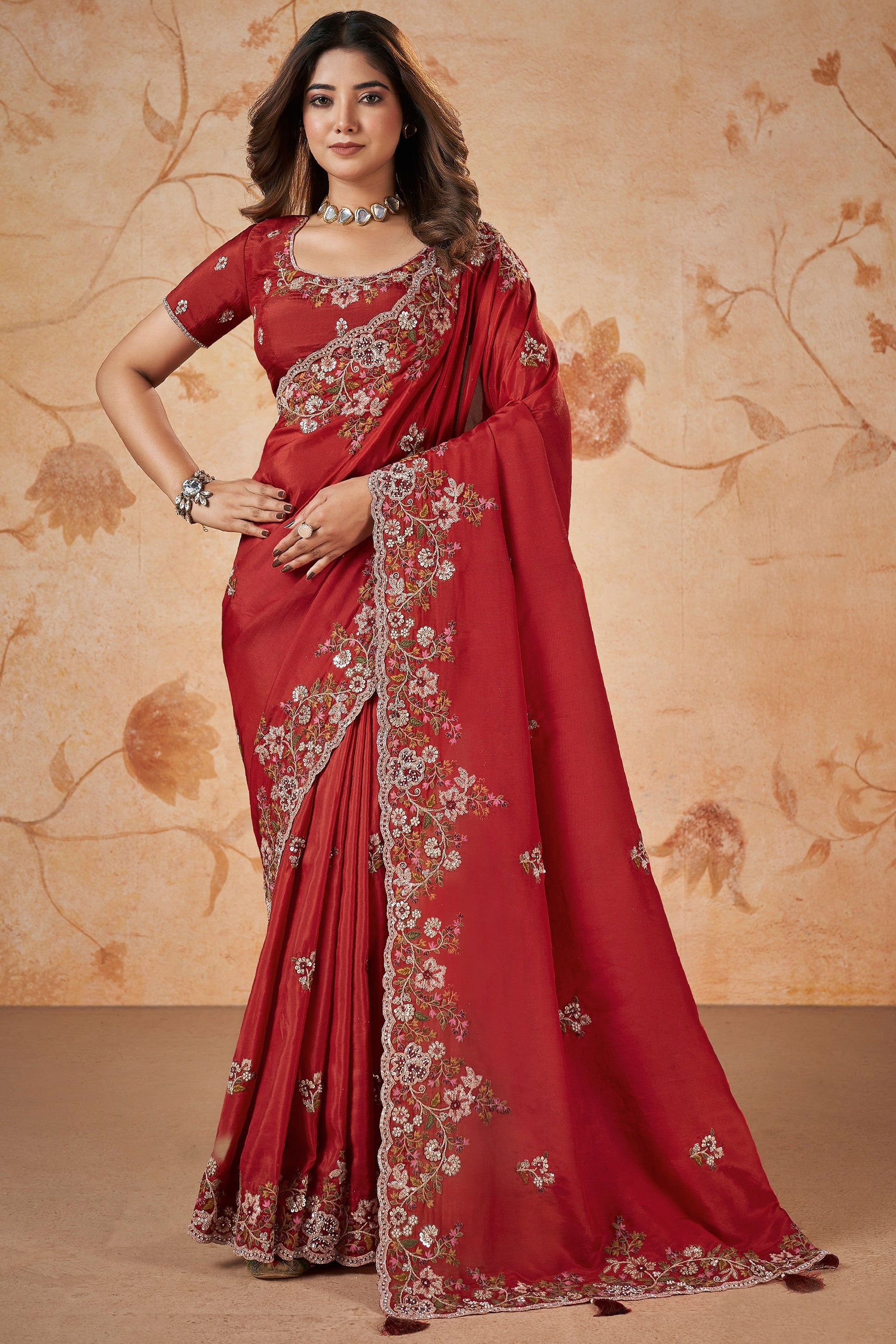 लाल रंग सेक्विन वर्क वेडिंग वियर आर्ट सिल्क फैब्रिक साड़ी