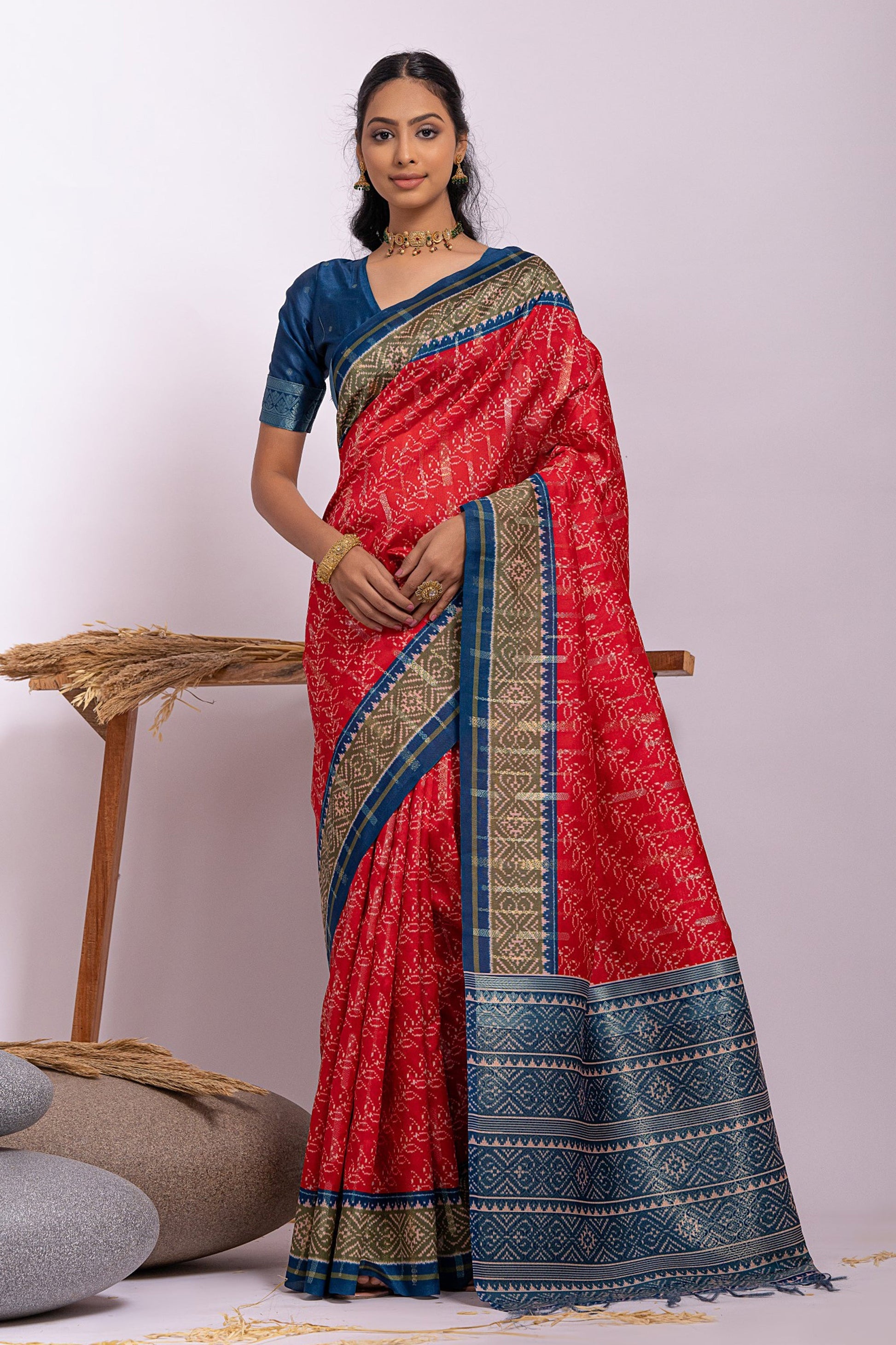 लाल रंग की सॉफ्ट टसर सिल्क फंक्शन वियर प्रिंटेड डिज़ाइनर साड़ी