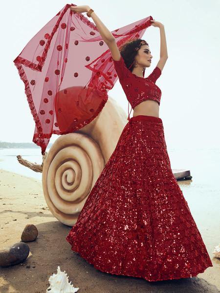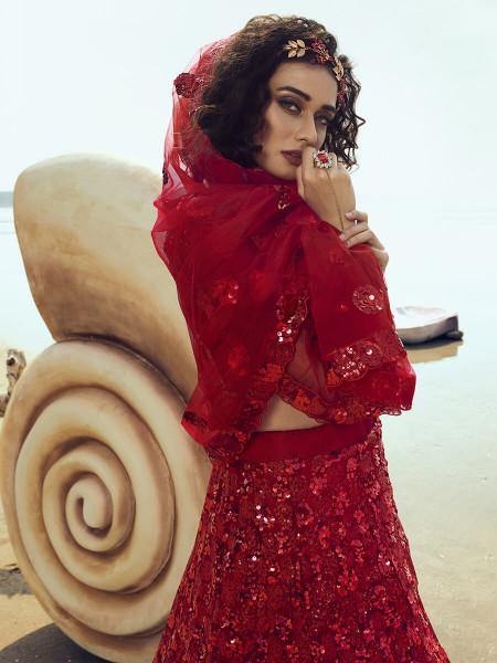 लाल कढ़ाई वाला नेट लहंगा नेट के ऊपर और नीचे की तरफ है, अंदर संतून है और साथ में नेट का दुपट्टा है। इस स्टाइल की कढ़ाई के लिए सेक्विन का इस्तेमाल किया गया है।