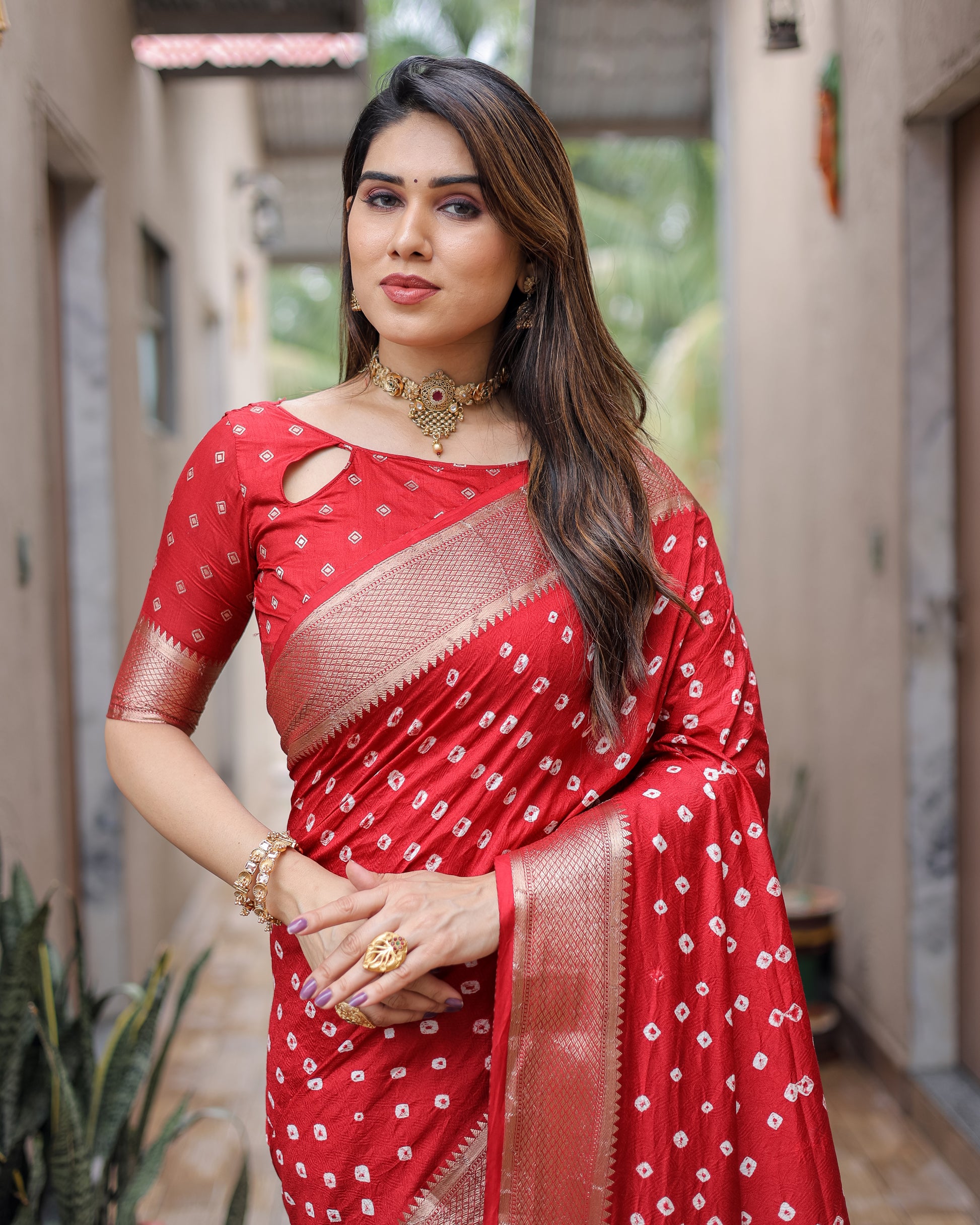 लाल यशोमति डोला नरम रेशम बंधेज साड़ी जरी बुनाई बॉर्डर के साथ
