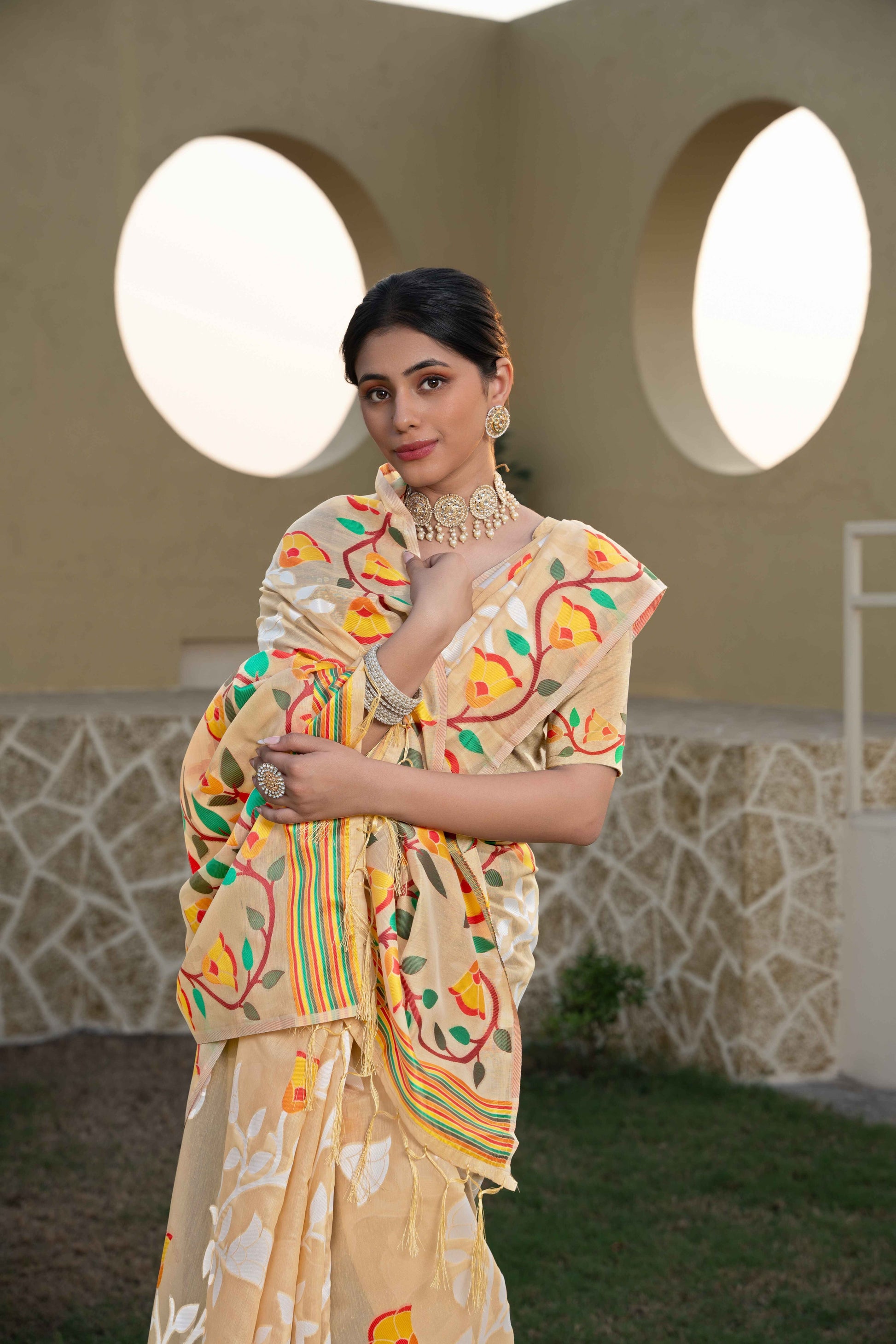 बेज रंग जामदानी सॉफ्ट कॉटन साड़ी अनस्टिच्ड ब्लाउज पीस के साथ
