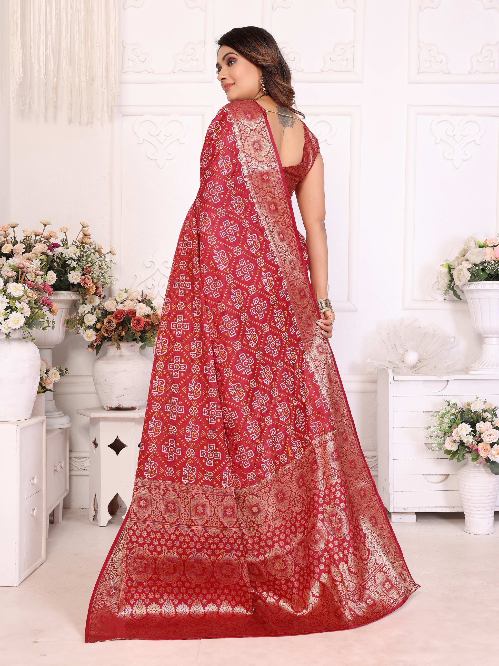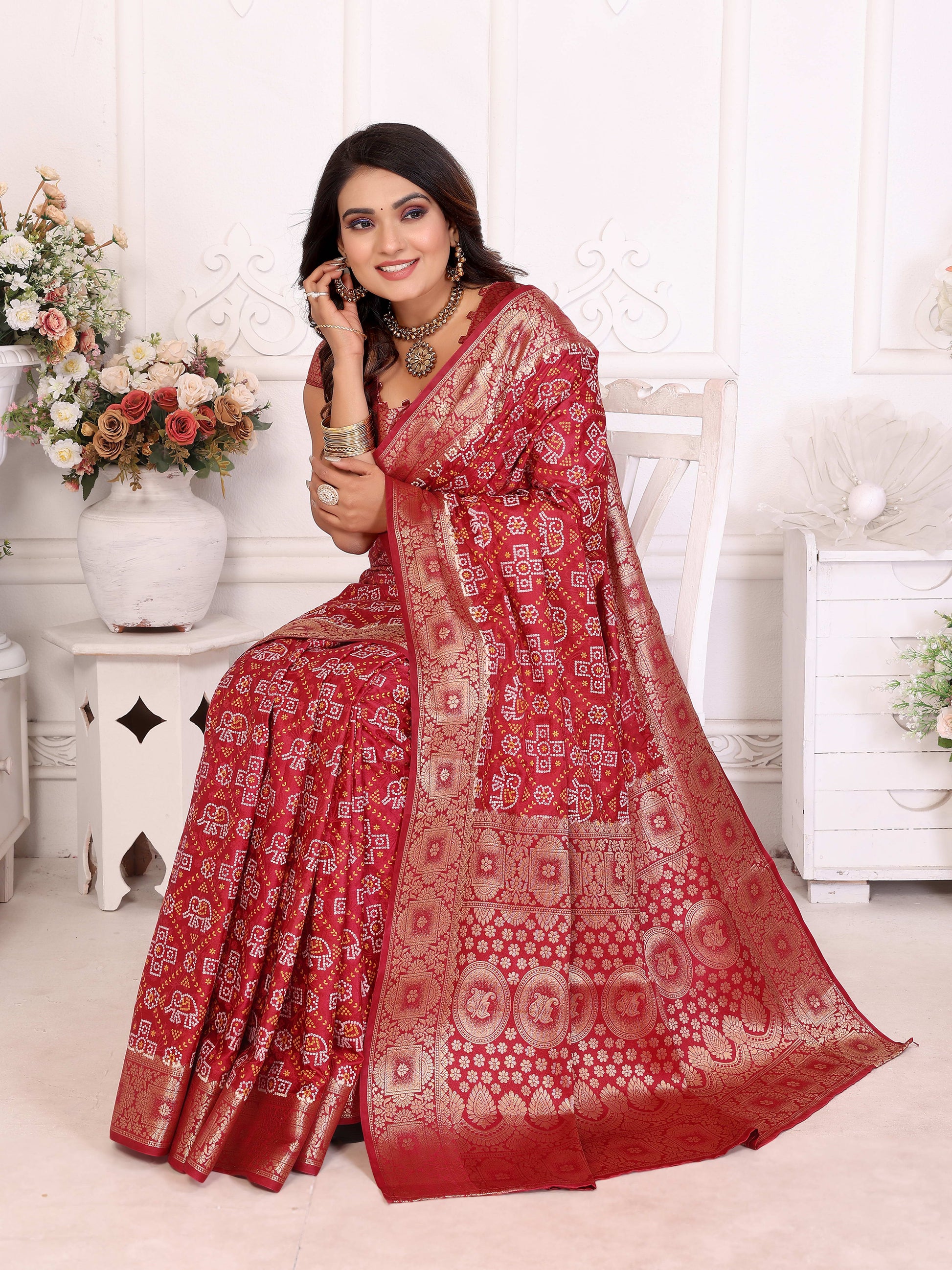 लाल समशीरा मुलायम साटन सिल्क बंधेज प्रिंट साड़ी, संपूर्ण ज़री बुनाई बॉर्डर के साथ