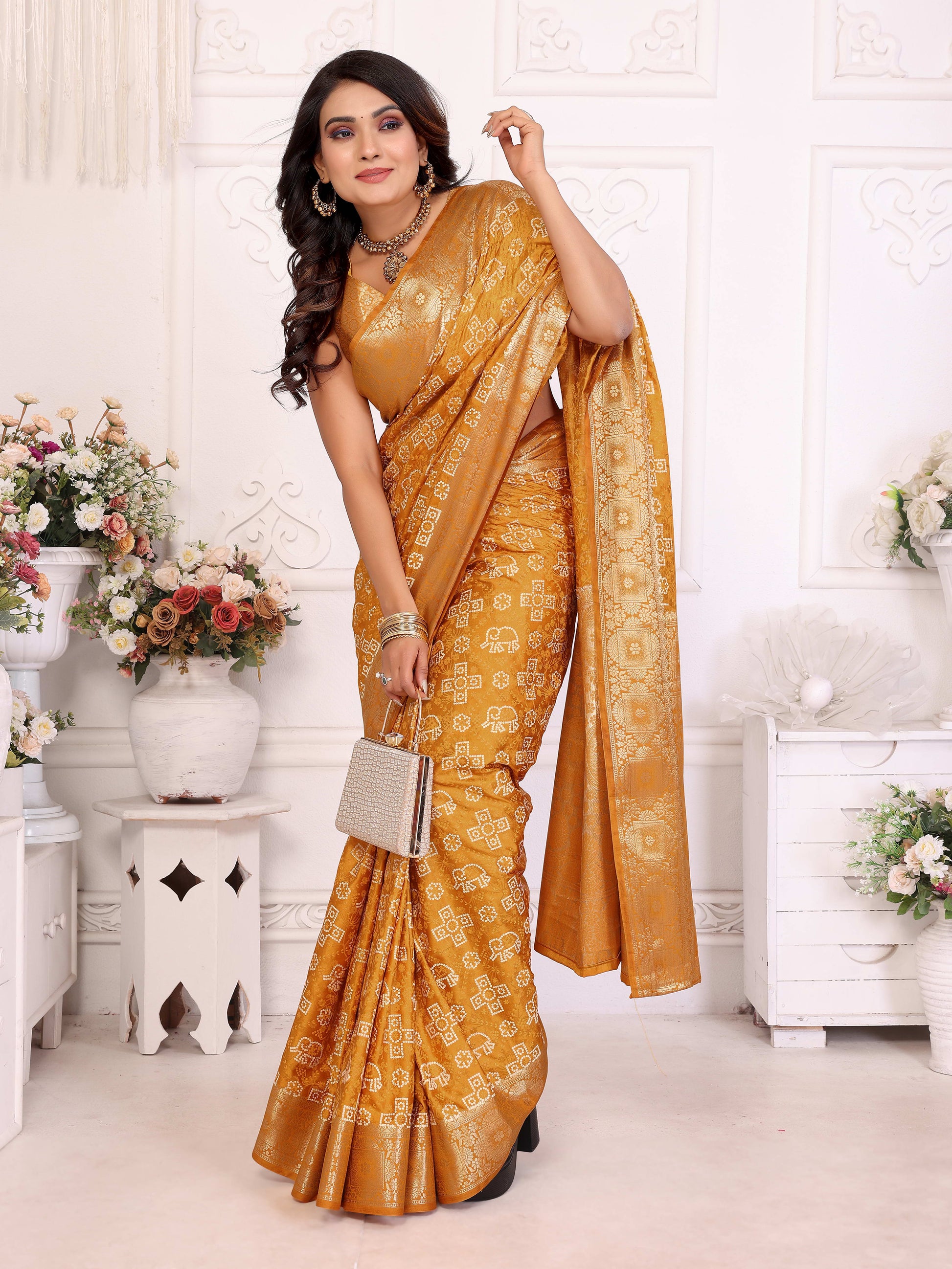 पीले रंग की समशीरा सॉफ्ट साटन सिल्क बंधेज प्रिंट साड़ी ऑलओवर ज़री बुनाई बॉर्डर के साथ