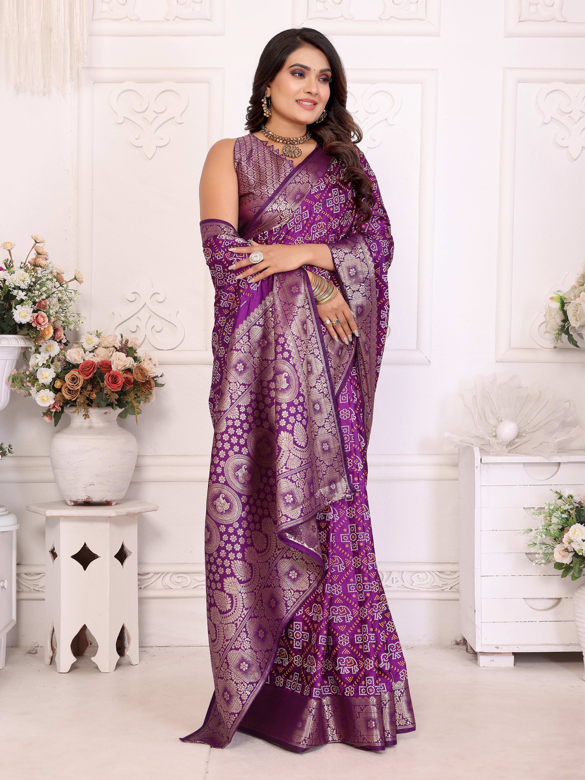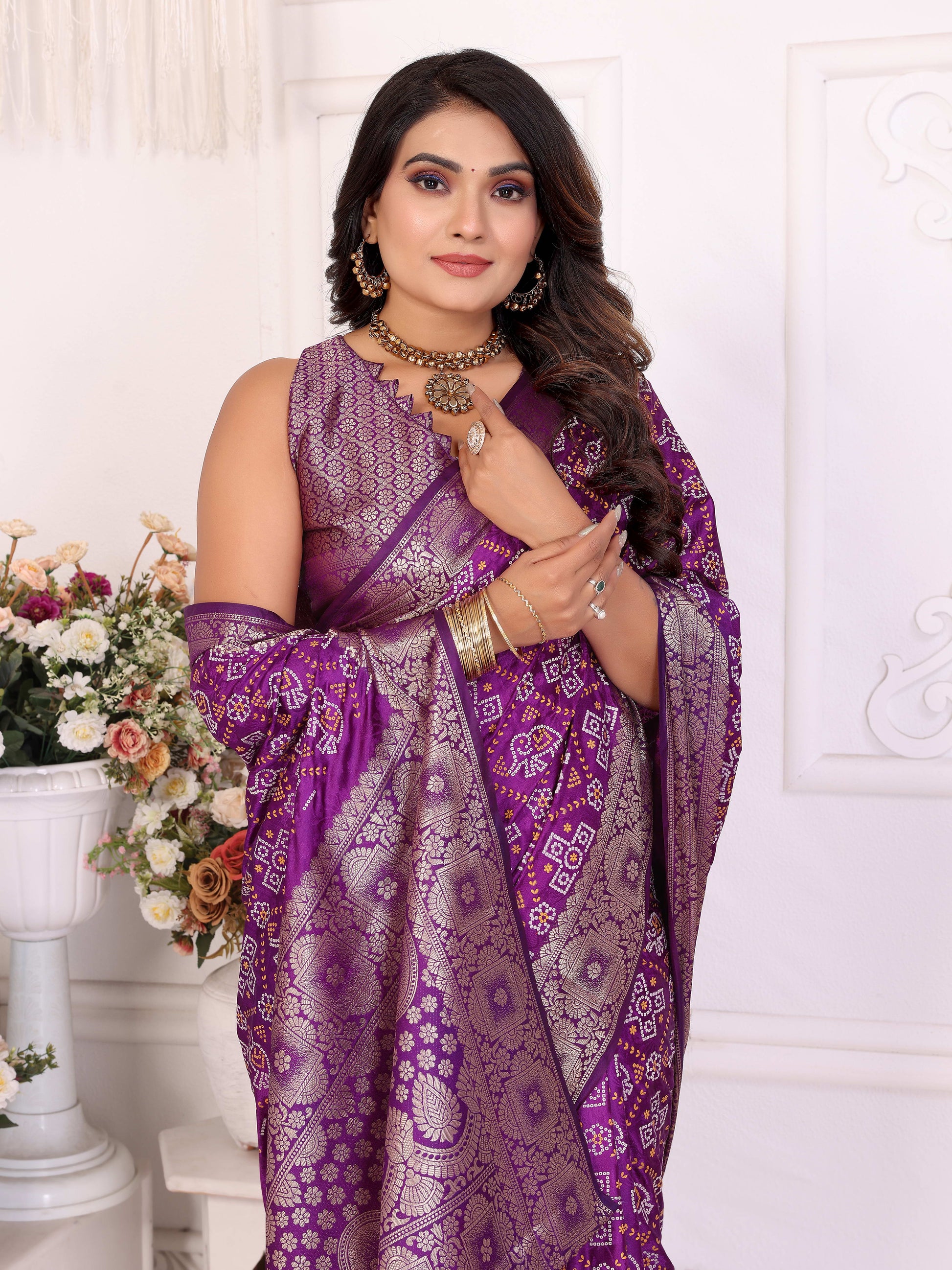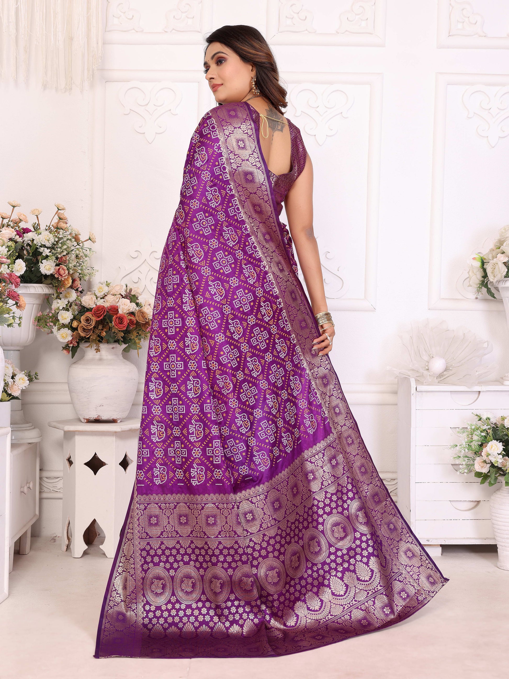 बैंगनी समशीरा मुलायम साटन सिल्क बंधेज प्रिंट साड़ी, संपूर्ण ज़री बुनाई बॉर्डर के साथ