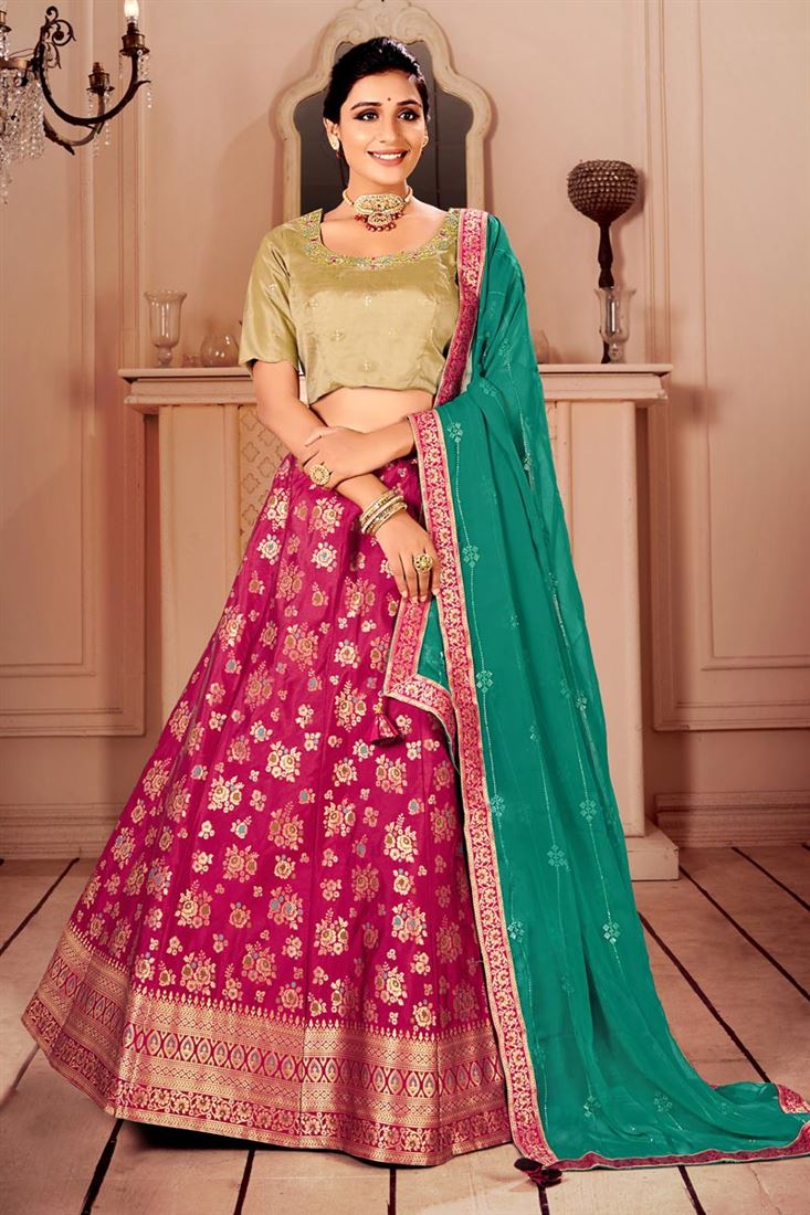 संगीत वियर आर्ट सिल्क फैब्रिक रानी रंग ठाठ लहंगा बुनाई के काम के साथ