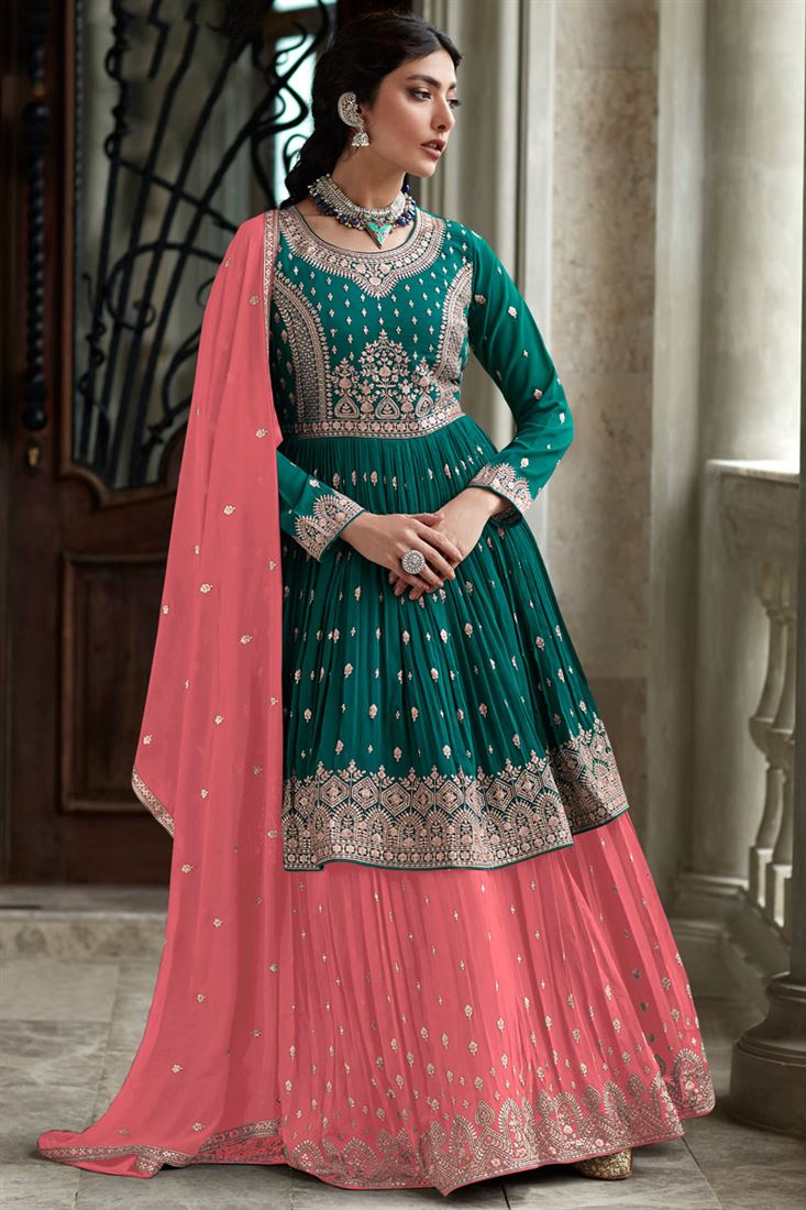 संगीत वियर पिंक कलर का आकर्षक जॉर्जेट शरारा टॉप लहंगा