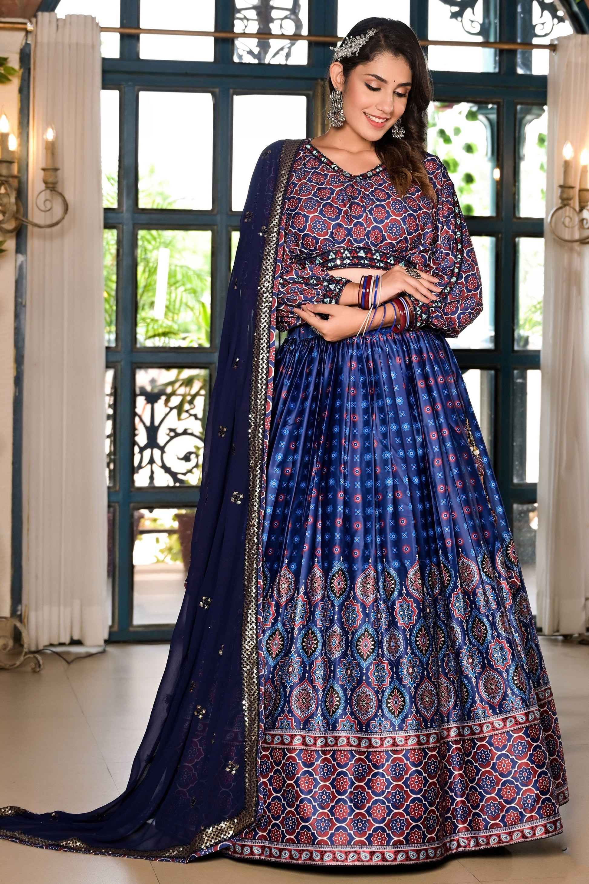 साटन फैब्रिक फंक्शन वियर प्रिंटेड रेडीमेड लहंगा चोली नीले रंग में