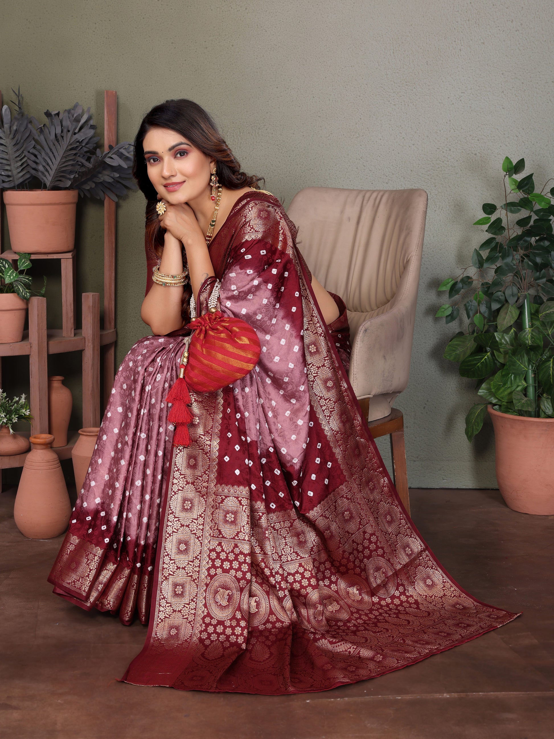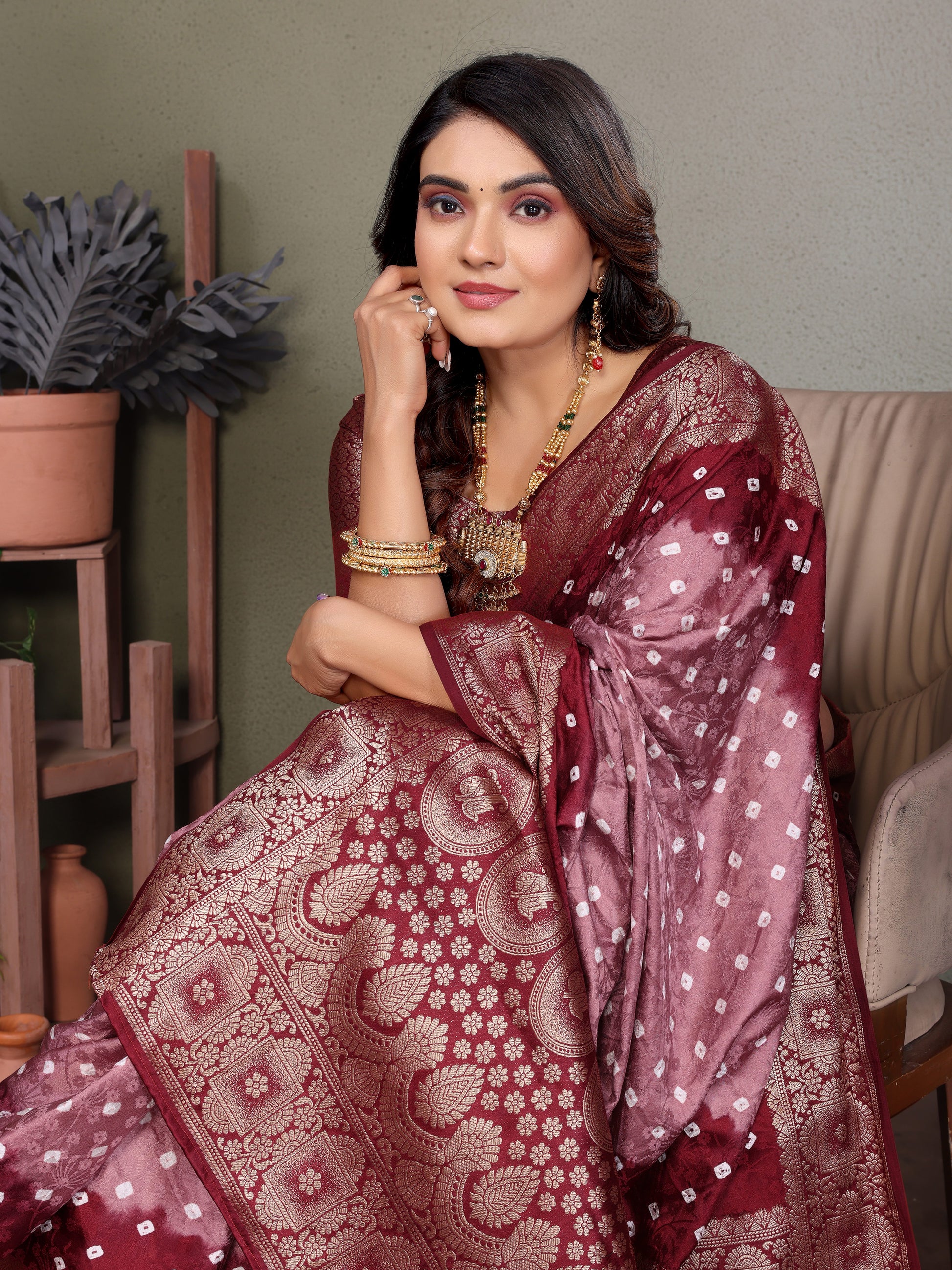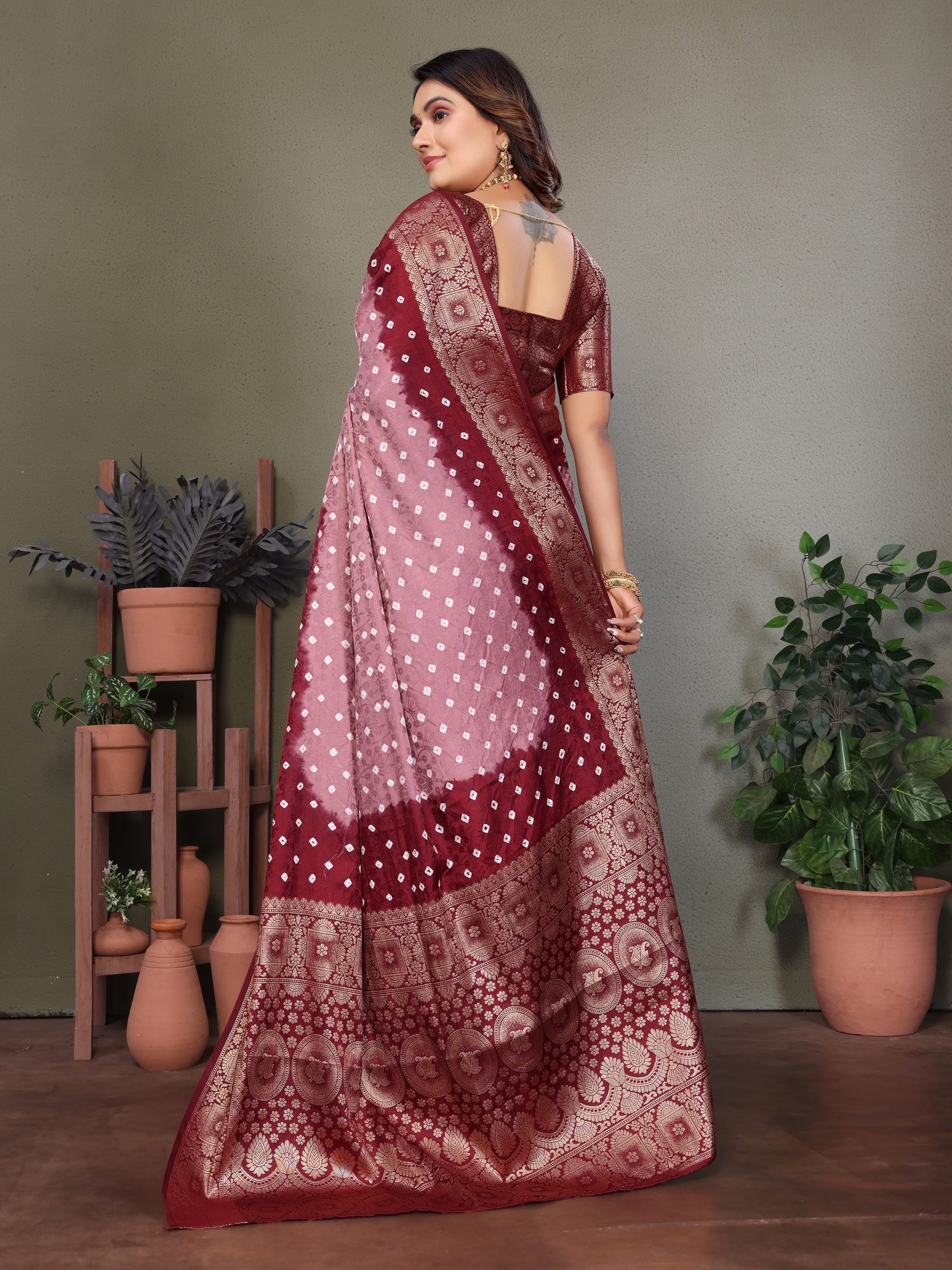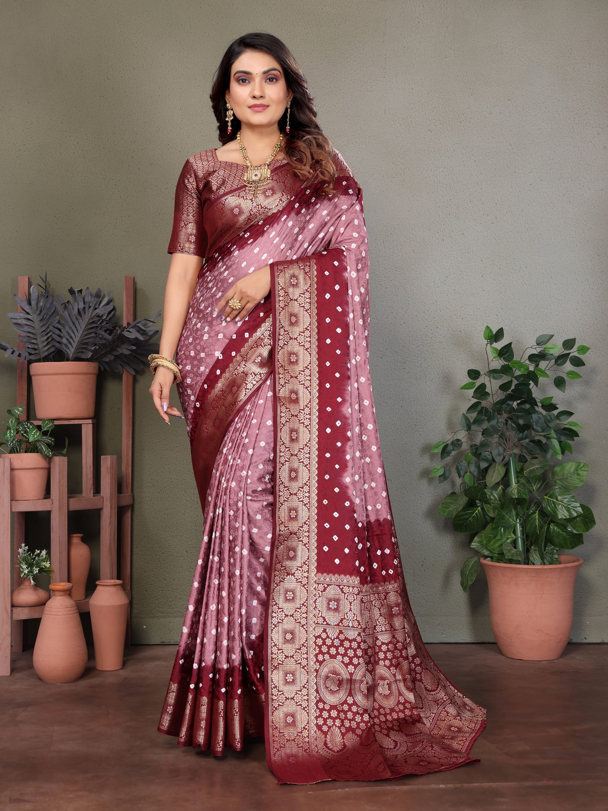 साड़ी का कपड़ा: बंधेज साटन सिल्क साड़ी ज़री बुनाई बॉर्डर के साथ