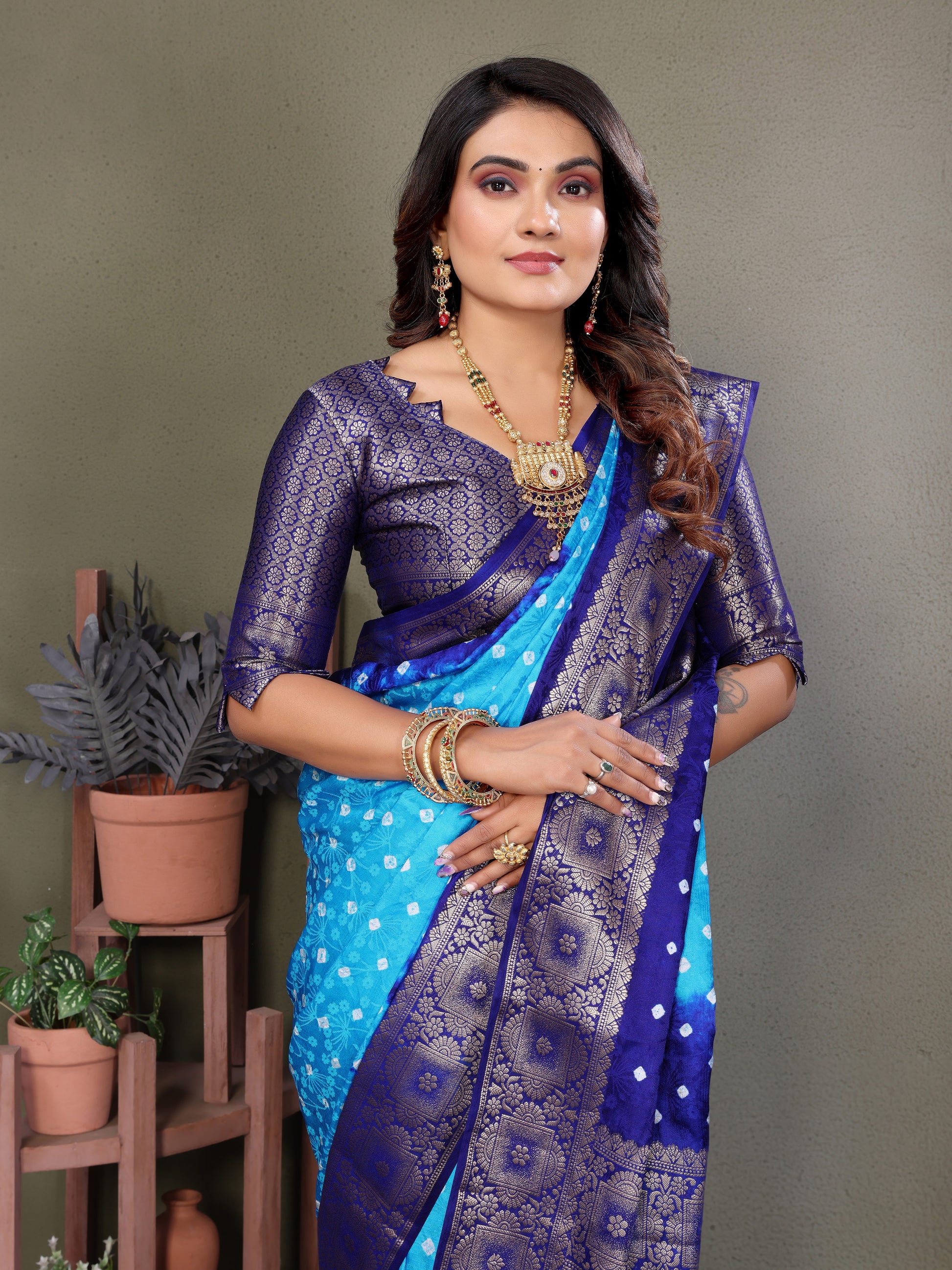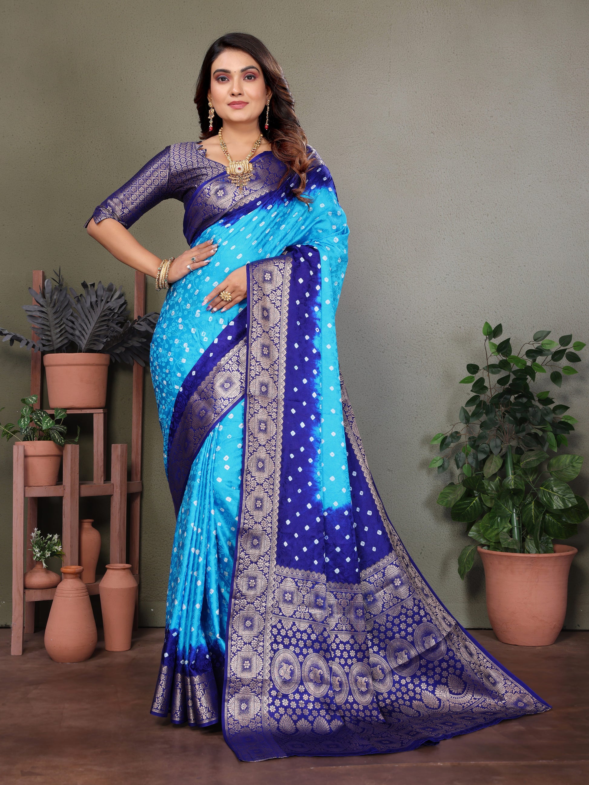 ज़री बुनाई बॉर्डर के साथ नीली सत्यवती बंधेज साटन सिल्क साड़ी