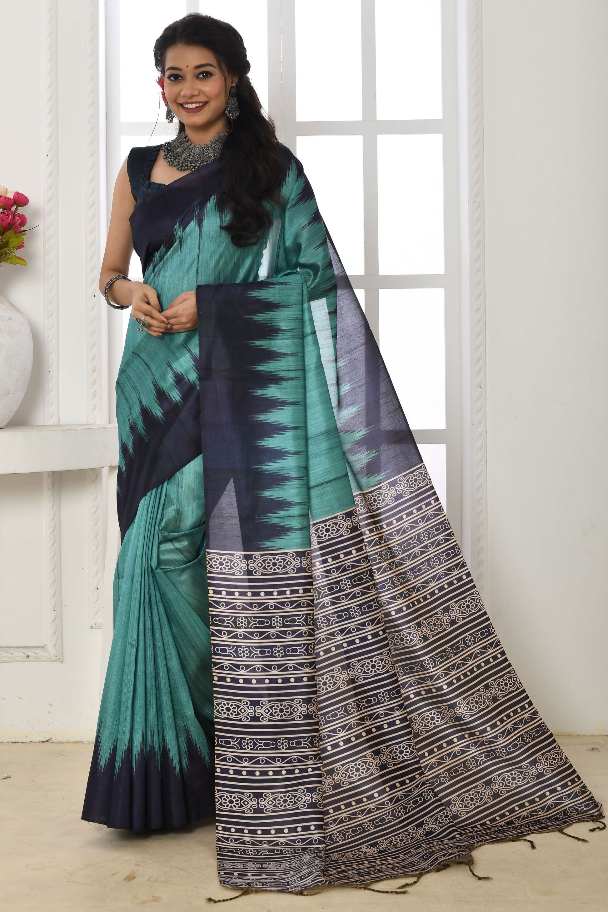 टेक्स्ट ब्लॉक आर्ट सिल्क फ़ैब्रिक में समुद्री हरे रंग की रोज़ पहनने वाली प्रिंटेड साड़ी