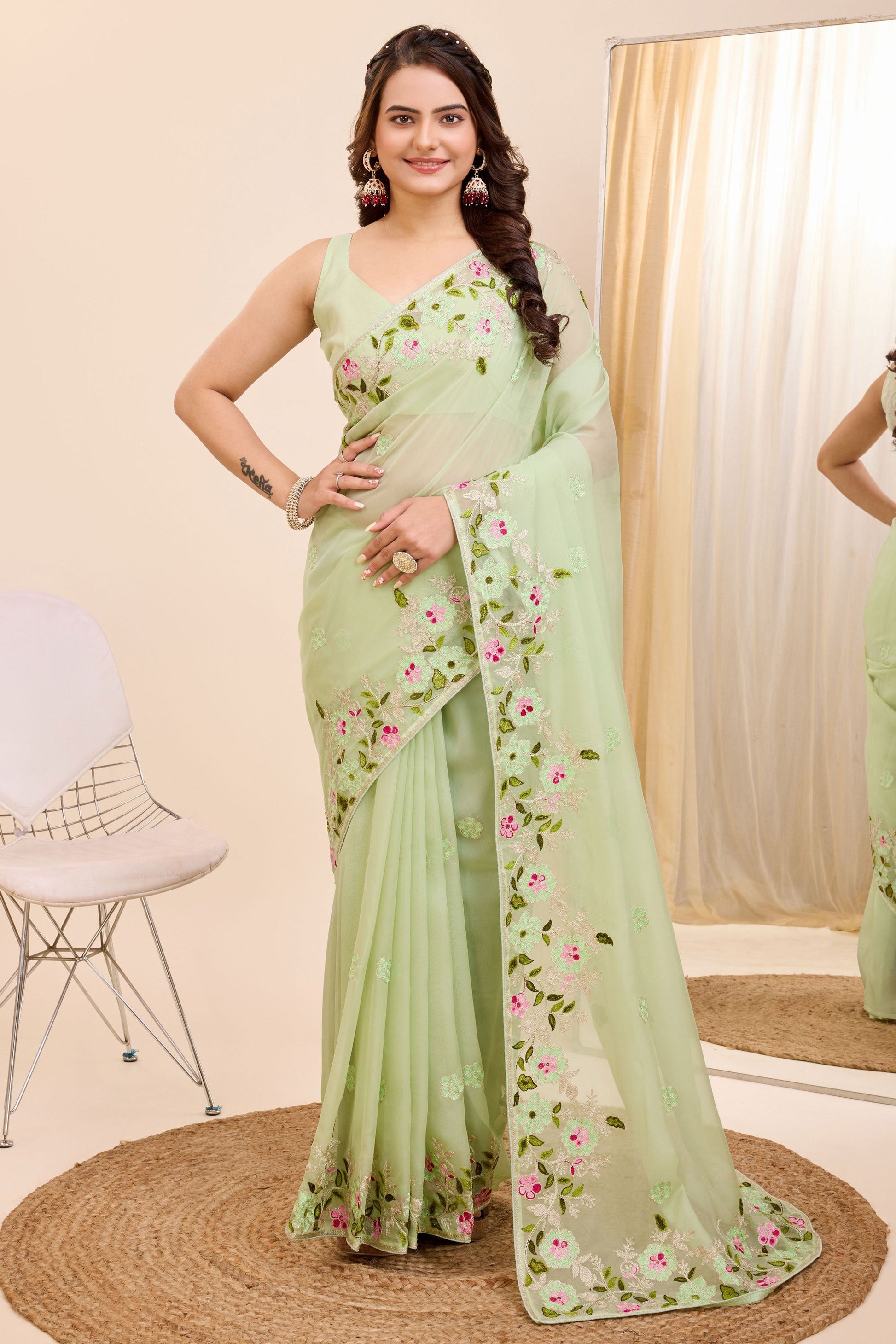 समुद्री हरा रंग कढ़ाई काम शानदार उत्सव पहनने कला रेशम साड़ी
