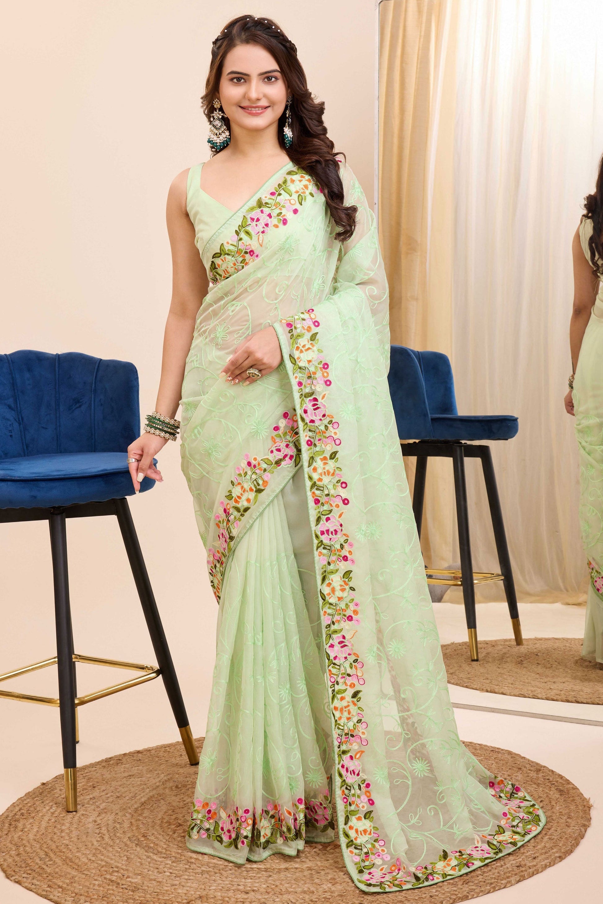 समुद्री हरा रंग कढ़ाई काम ग्लैमरस त्यौहार पहनने कला रेशम साड़ी