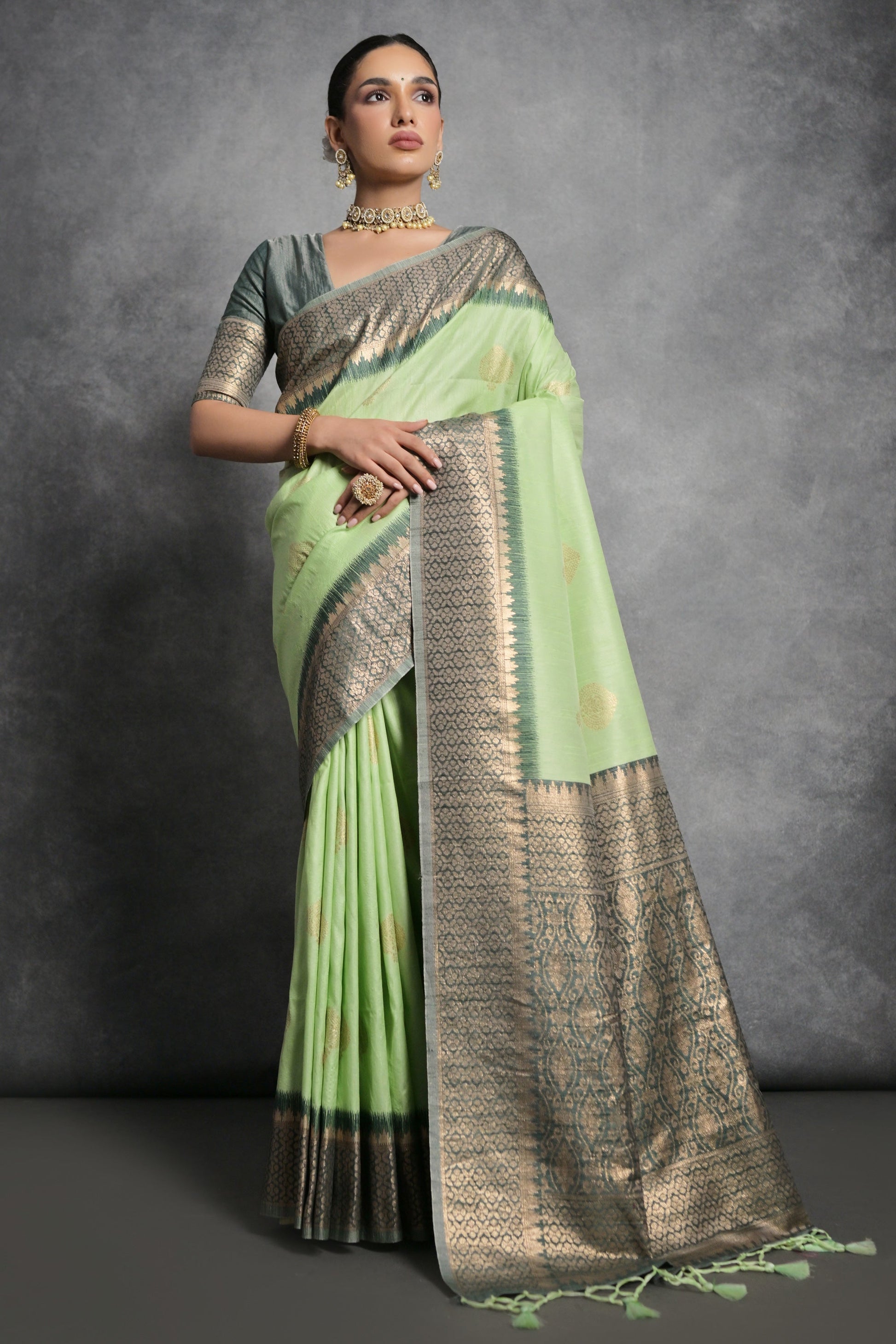 समुद्री हरे रंग की विशेष ज़री बुनाई बॉर्डर वर्क टसर सिल्क साड़ियाँ