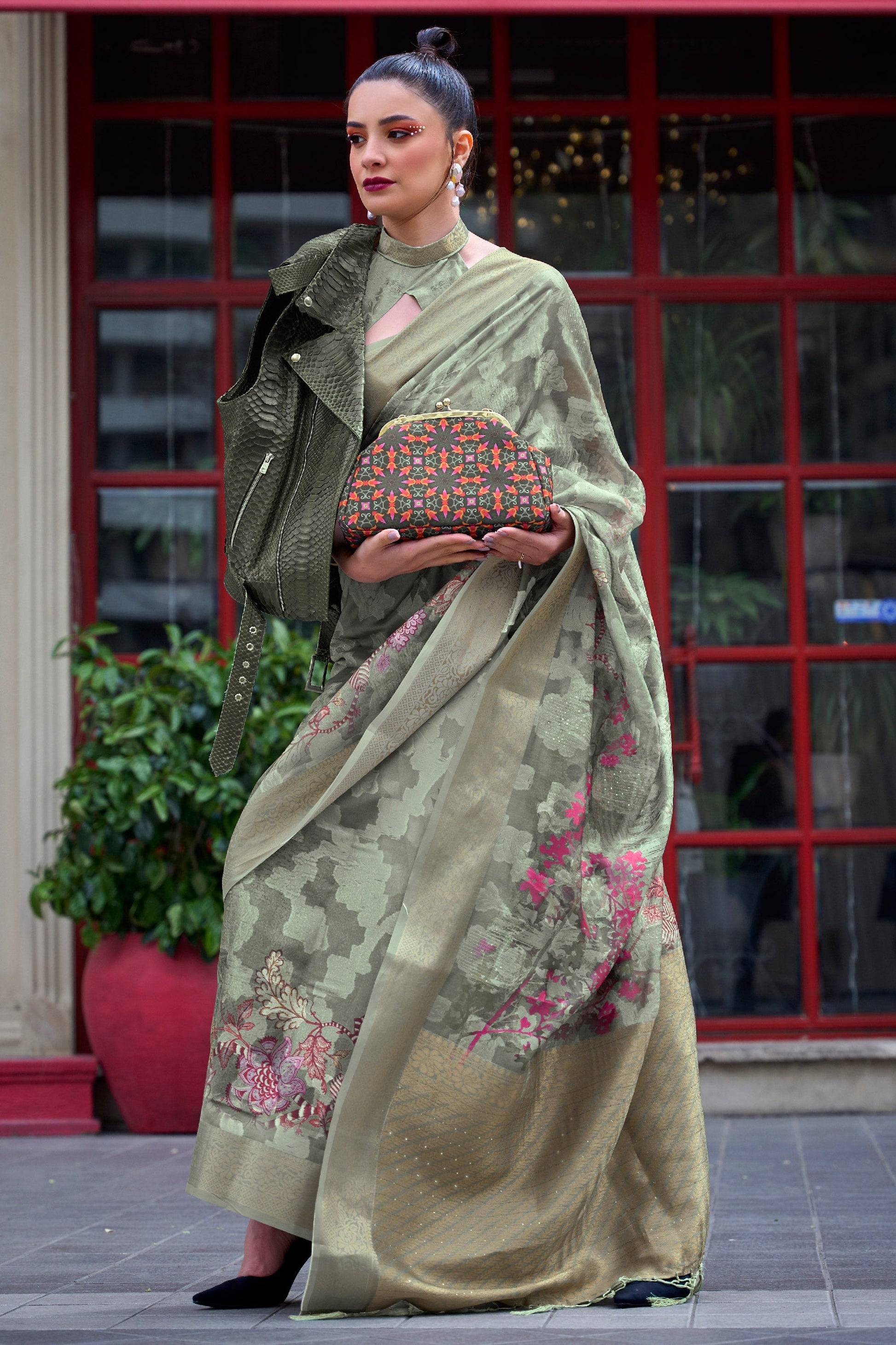 समुद्री हरा रंग मुद्रित कार्य ब्रासो फैब्रिक ठाठ साड़ी