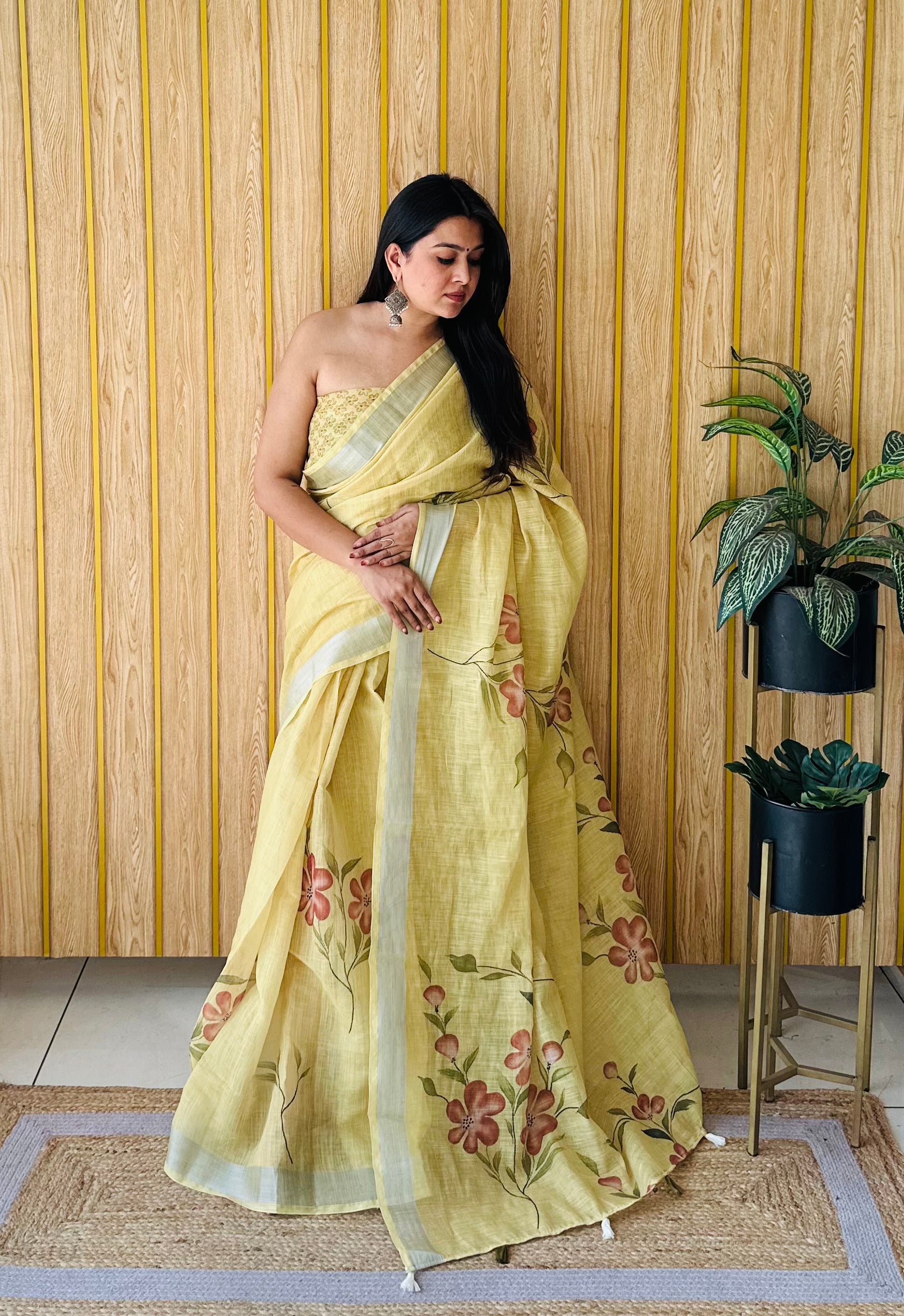 पीले रंग की प्रीमियम क्वालिटी सॉफ्ट लिनन कॉटन डिजिटल प्रिंट साड़ी सिल्वर बॉर्डर के साथ