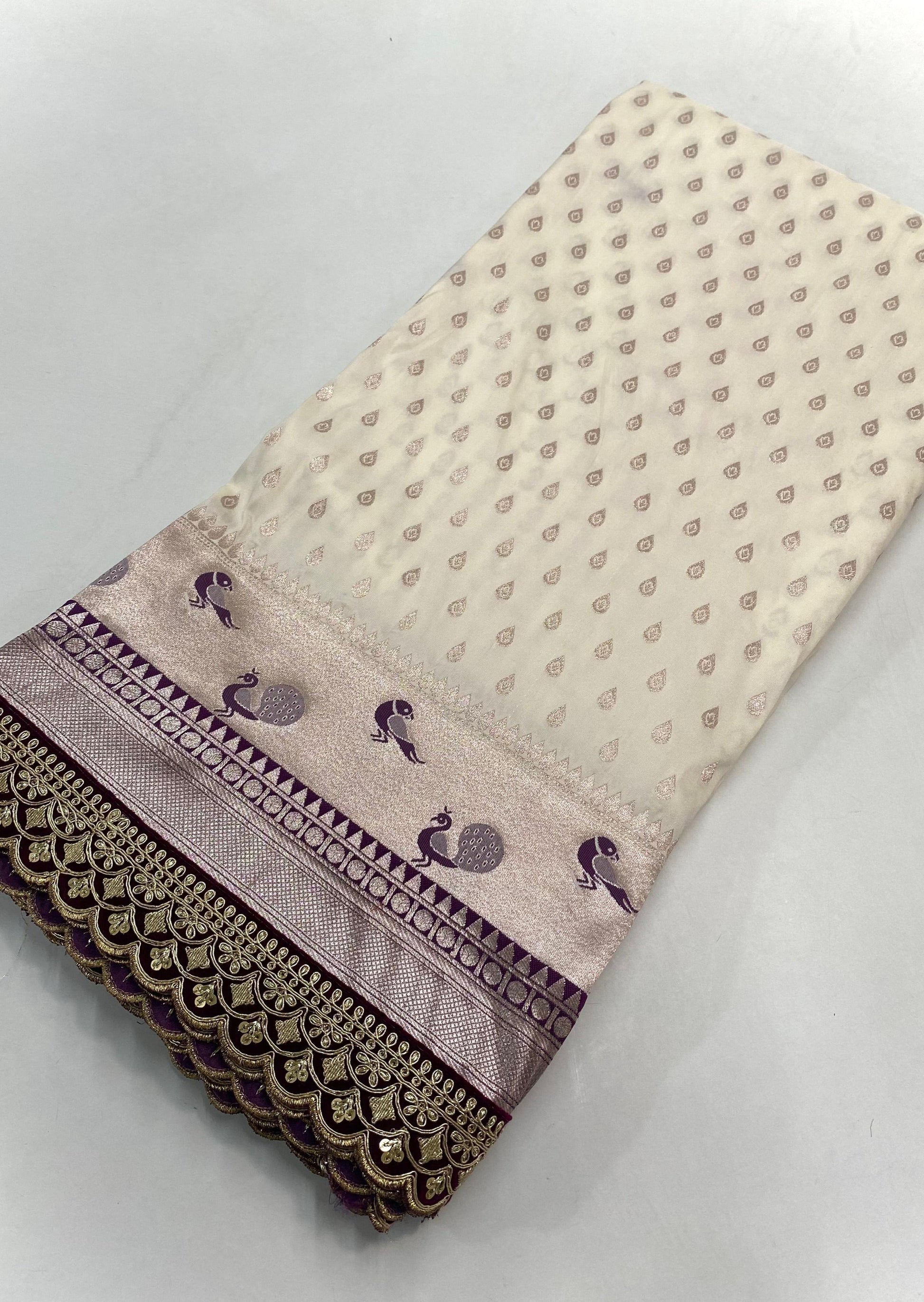 इस शानदार बनारसी सिल्क साड़ी में उत्तम बनारसी पैठणी और डॉट बुनाई पैटर्न है, साथ ही सुरुचिपूर्ण मोर रूपांकनों से सजी एक समृद्ध वर्क बॉर्डर है। सुंदर लेस, कटवर्क के साथ, यह एक परिष्कृत आकर्षण प्रदान करता है। जटिल बुनाई, डबल कढ़ाई और सेक्विन बॉर्डर, और पल्लू पर स्कैलप्ड डिज़ाइन इसकी कालातीत सुंदरता को बढ़ाते हैं। इस बेहतरीन साड़ी के साथ नवीनतम फैशन ट्रेंड के साथ बने रहें।