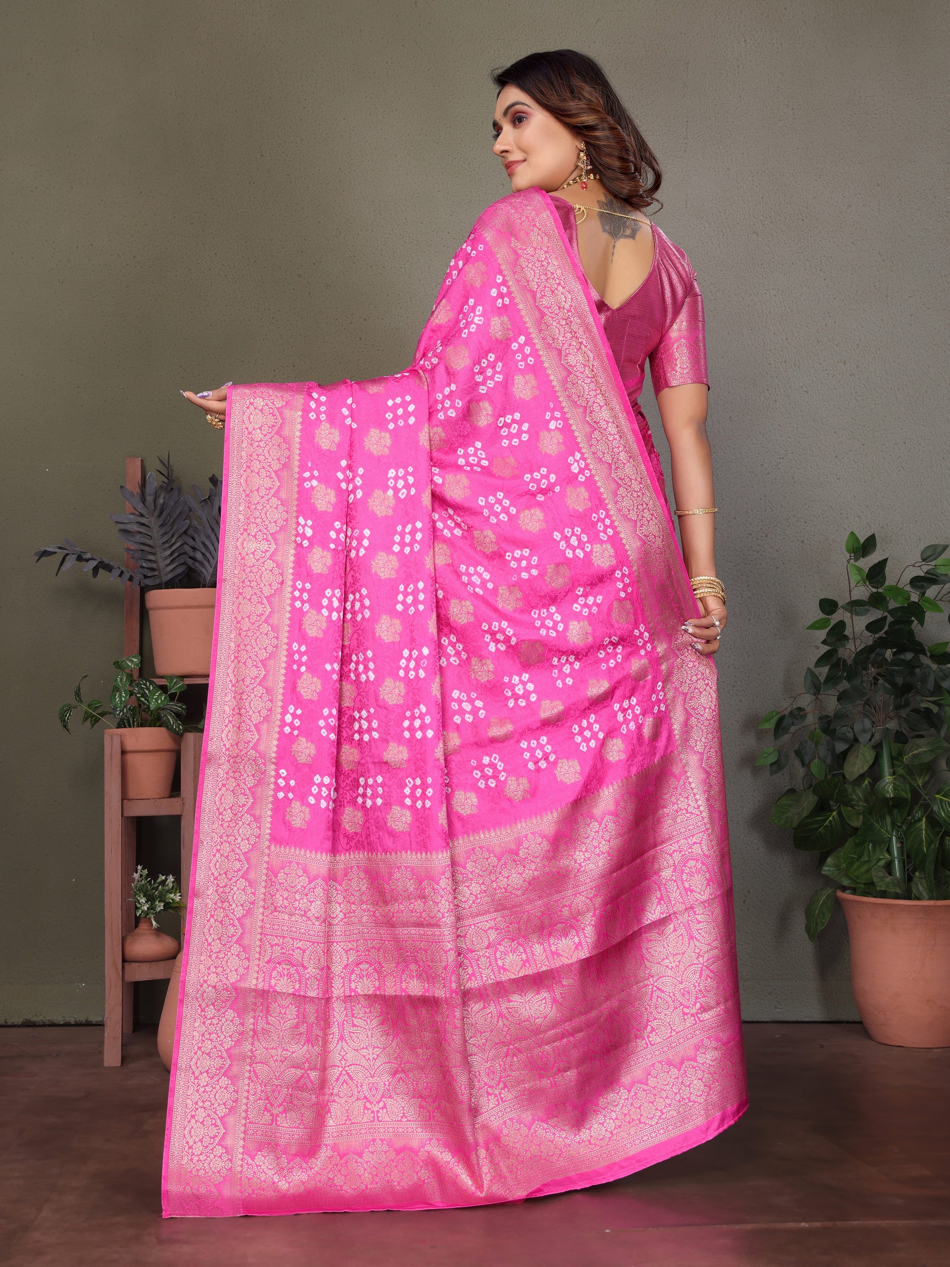गुलाबी शकुंतला बंधेज साटन सिल्क साड़ी, पूरी साड़ी और बॉर्डर पर ज़री बुनाई बूटा के साथ