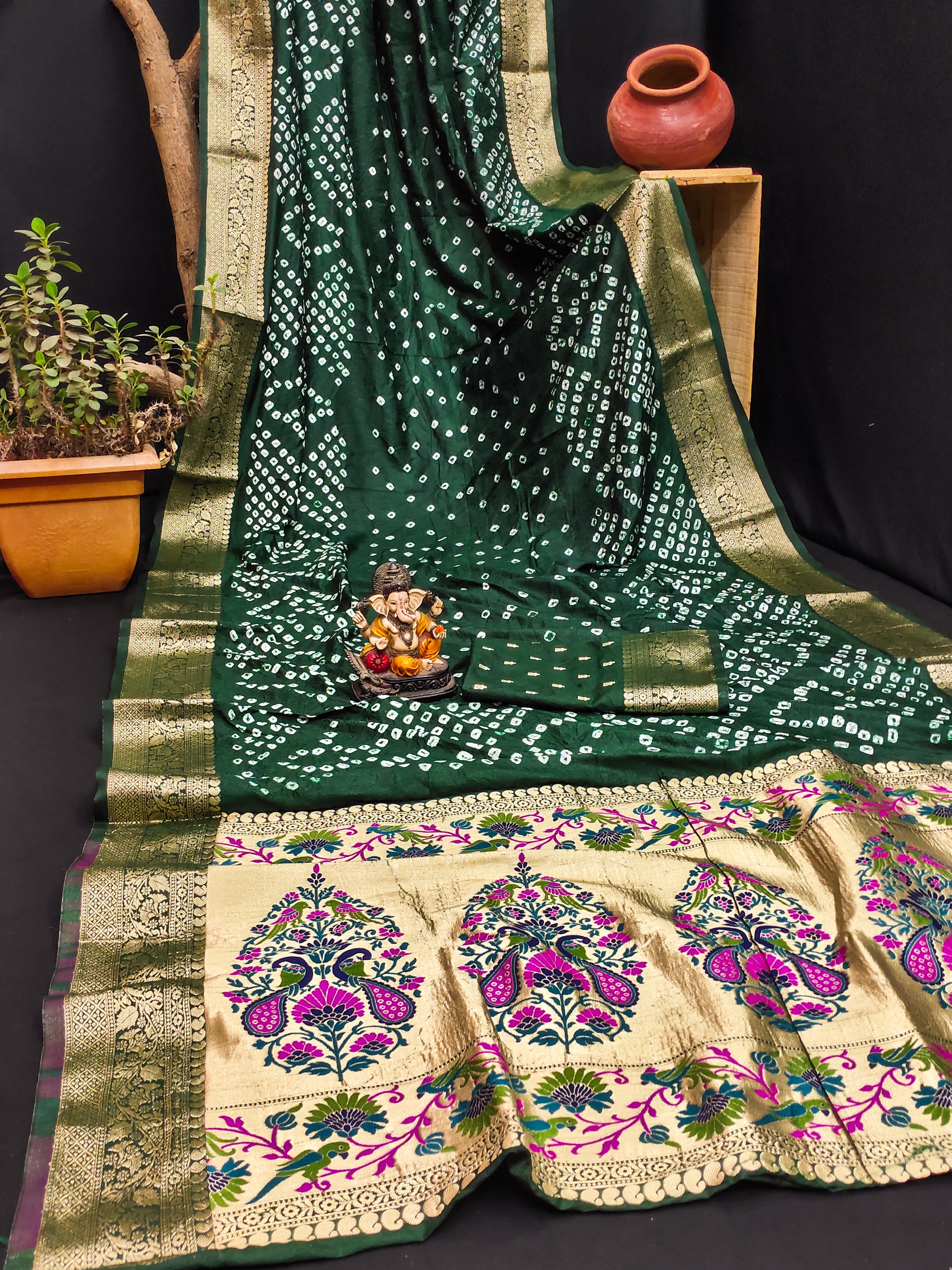 साड़ी का कपड़ा:- बंधेज कांजीवरम सिल्क साड़ी कांजीवरम बॉर्डर के साथ ज़री बुनाई पैठानी रिच पल्लू के साथ