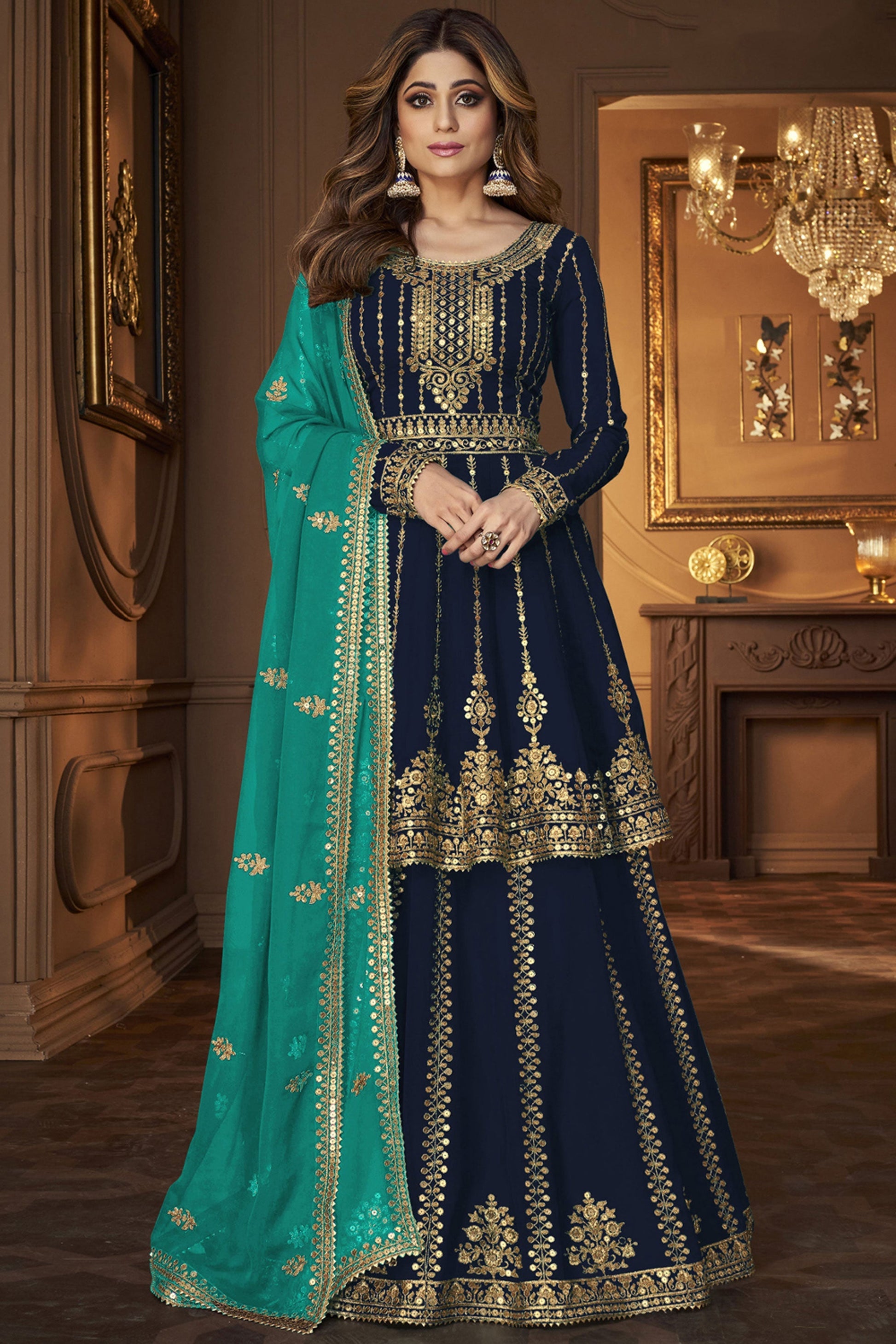 टेक्स्ट ब्लॉक शमिता शेट्टी का जॉर्जेट फैब्रिक में मंत्रमुग्ध कर देने वाला नेवी ब्लू कलर का शरारा टॉप लहंगा