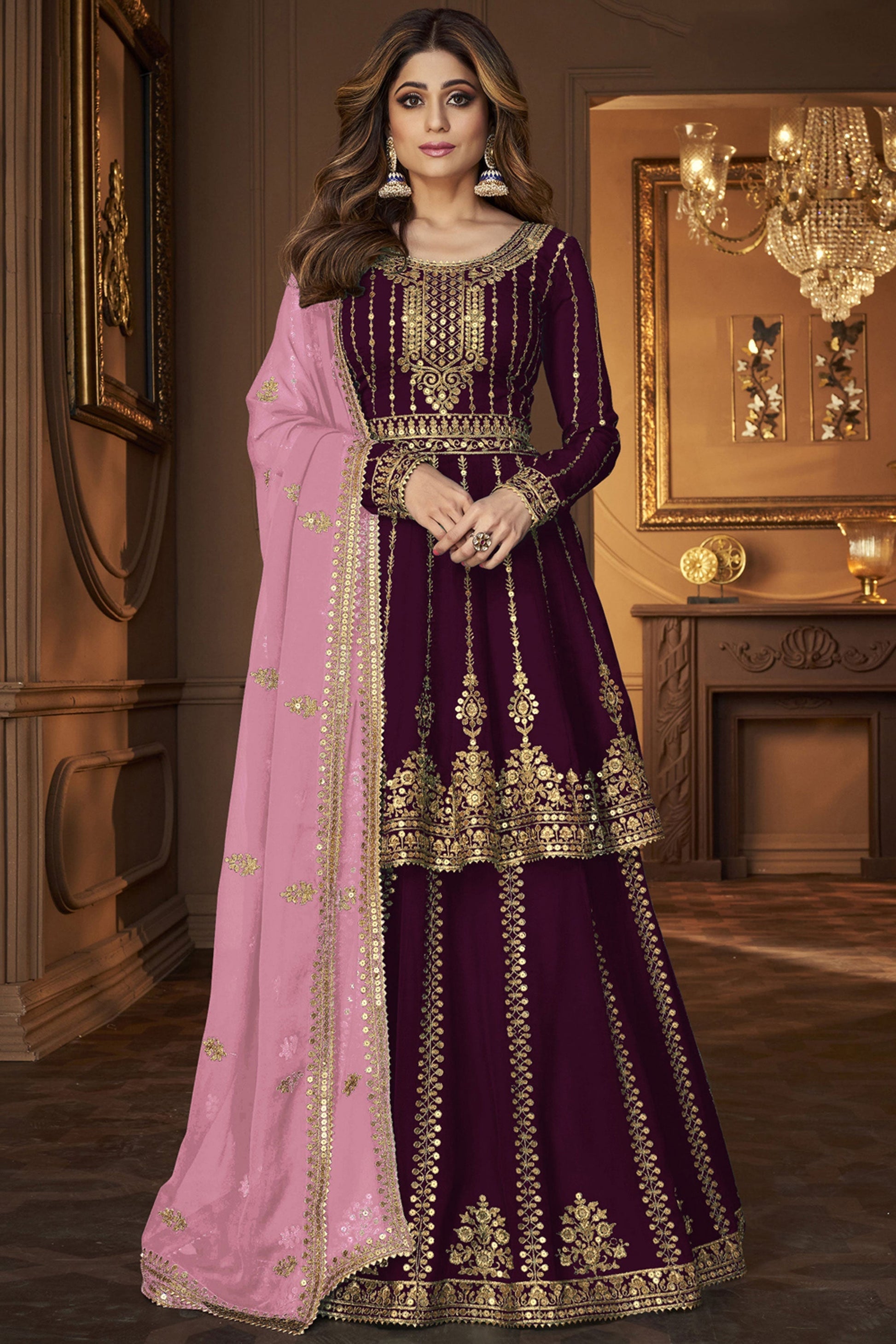 शमिता शेट्टी रेडिएंट पर्पल कलर जॉर्जेट फैब्रिक शरारा टॉप लहंगा
