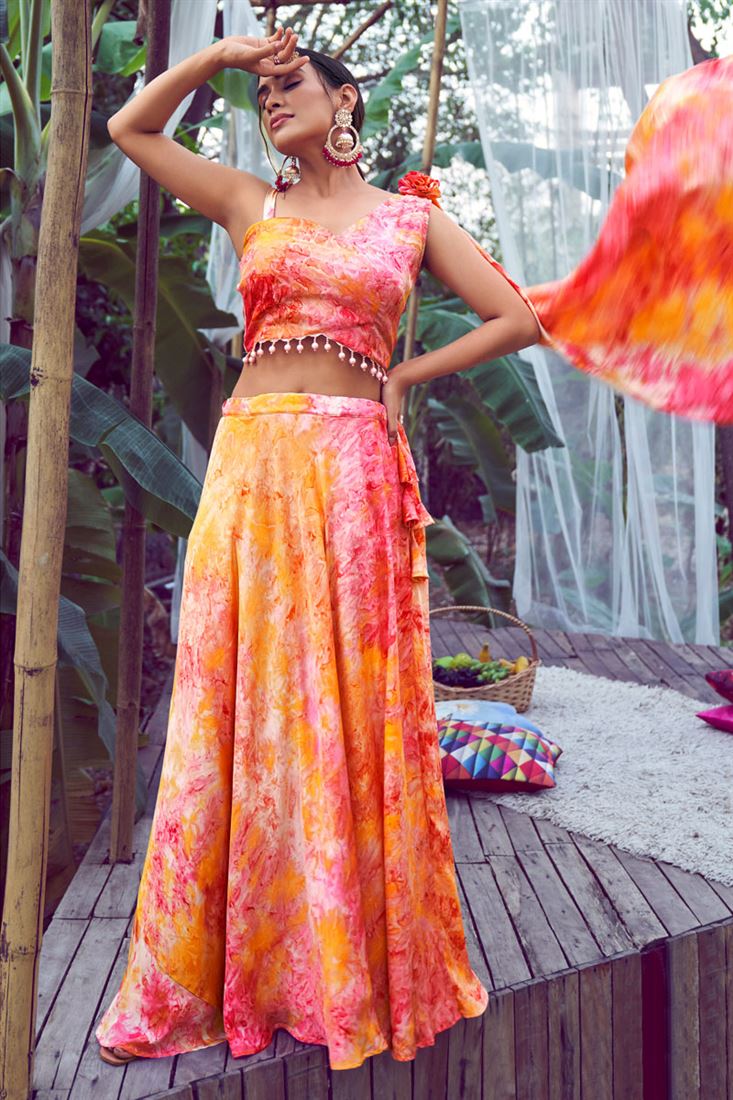सिल्क फैब्रिक ऑरेंज कलर आकर्षक पार्टी वियर रेडीमेड प्रिंटेड लहंगा