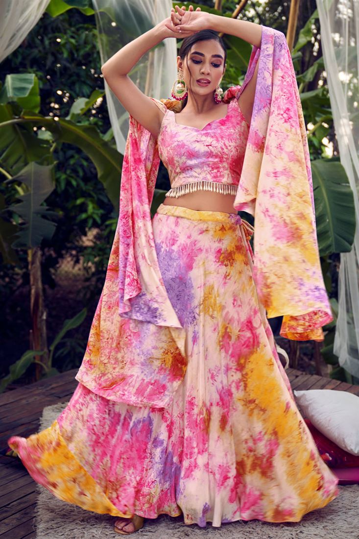 सिल्क फैब्रिक पर्पल और पिंक कलर का ग्लैमरस पार्टी वियर रेडीमेड प्रिंटेड लहंगा