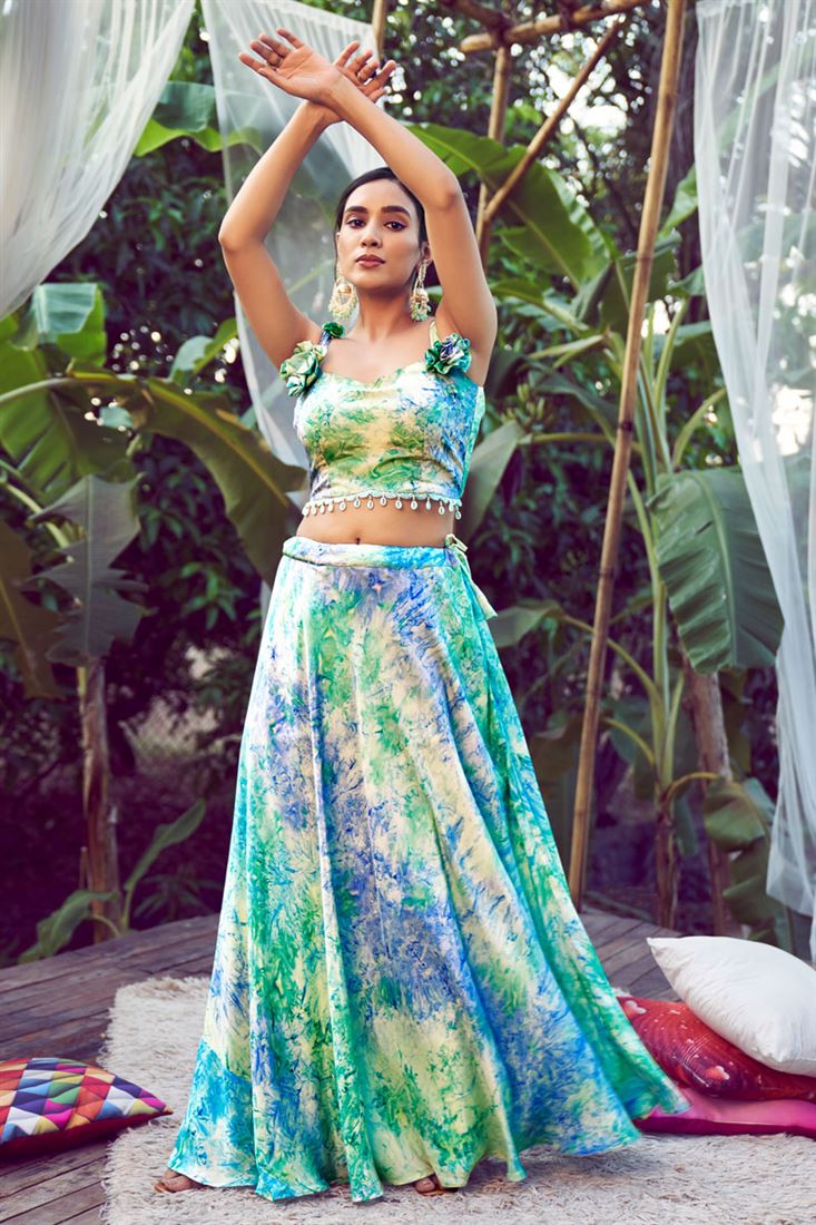 स्काई ब्लू कलर का सिल्क फैब्रिक आकर्षक पार्टी वियर रेडीमेड प्रिंटेड लहंगा