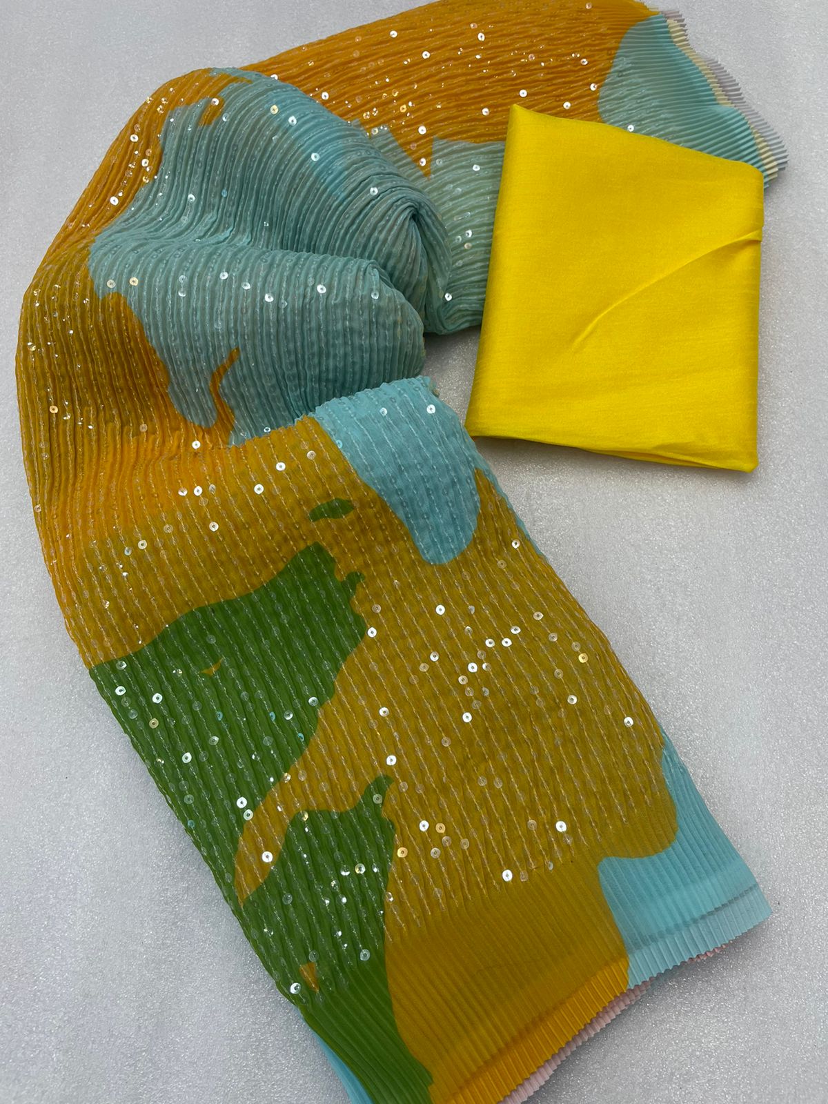 सॉफ्ट क्रश जॉर्जेट प्रिंट क्रश्ड सीक्वेंस साड़ी