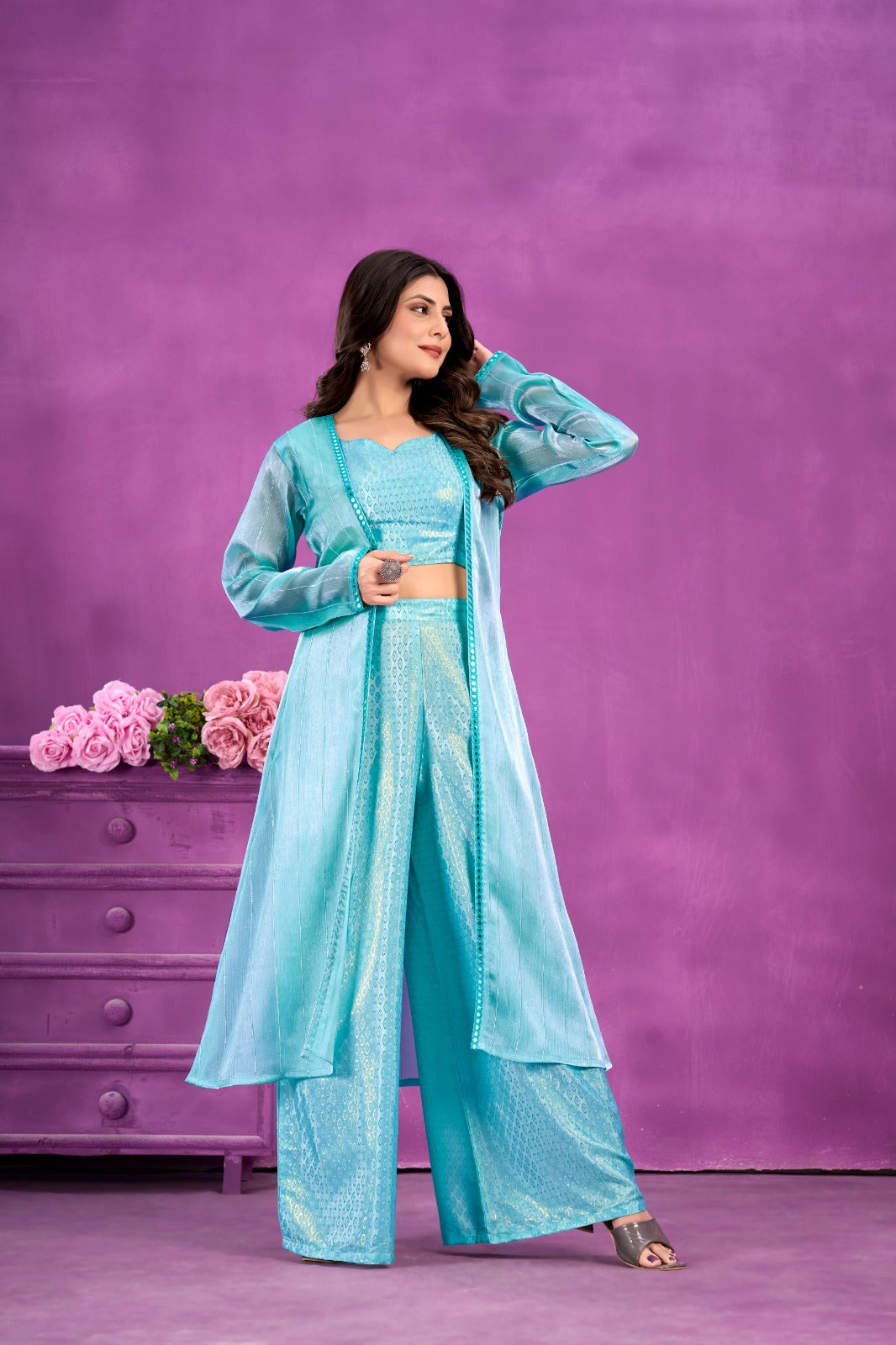 महिलाओं के लिए हमारे सॉफ्ट सिल्क टॉप, प्लाज़ो और श्रग 3-पीस सेट के शानदार आकर्षण का आनंद लें। यह उत्तम पहनावा अनुग्रह, परिष्कार और कालातीत शैली का प्रतीक है, जो आपको आराम और लालित्य का सही संयोजन प्रदान करता है।