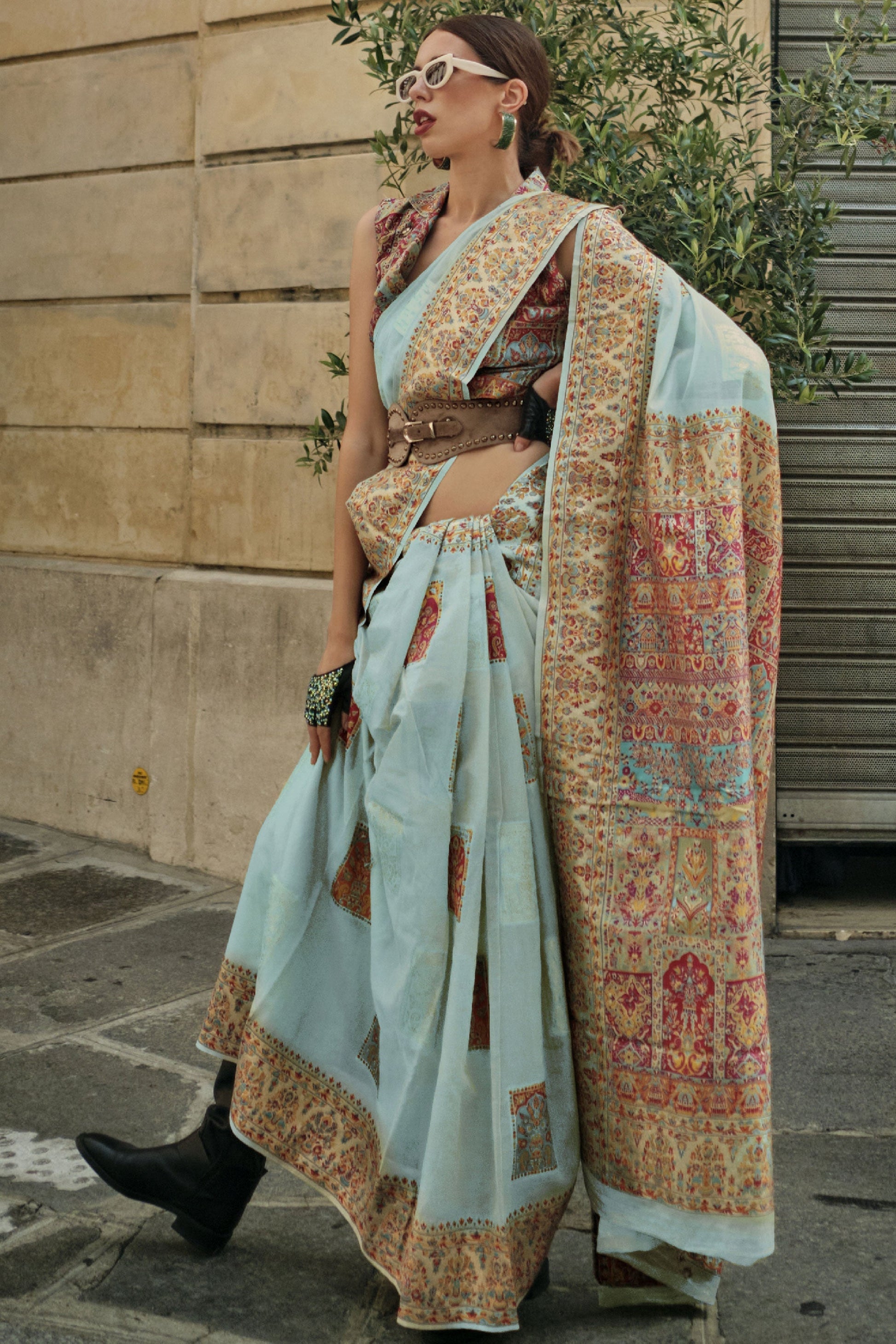 सुखदायक हल्के सियान रंग की कश्मीरी मॉडल हैंडलूम बुनाई सिल्क साड़ी कश्मीरी ब्लाउज के साथ