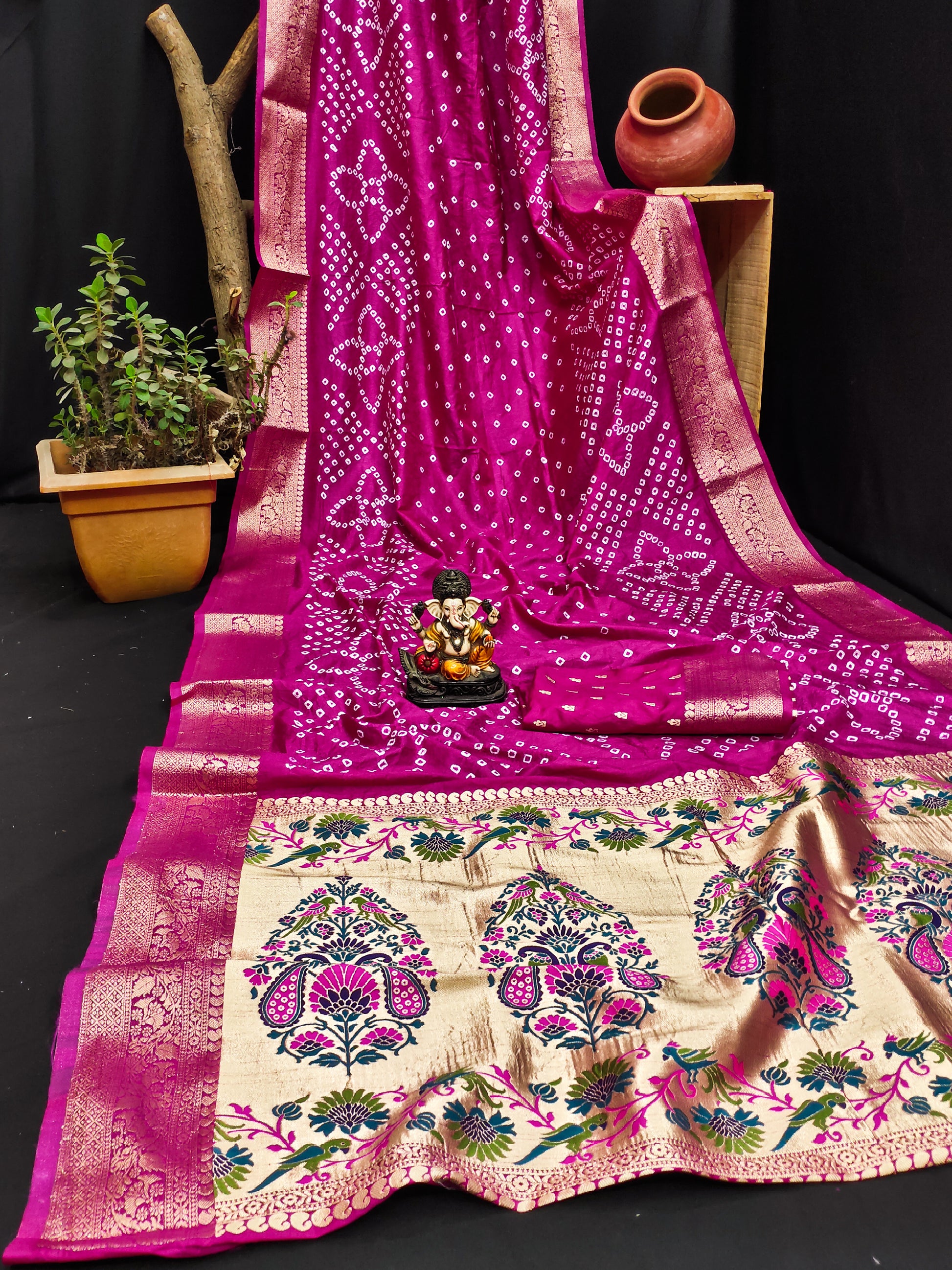 साड़ी का कपड़ा:- बंधेज कांजीवरम सिल्क साड़ी कांजीवरम बॉर्डर के साथ ज़री बुनाई पैठानी रिच पल्लू के साथ