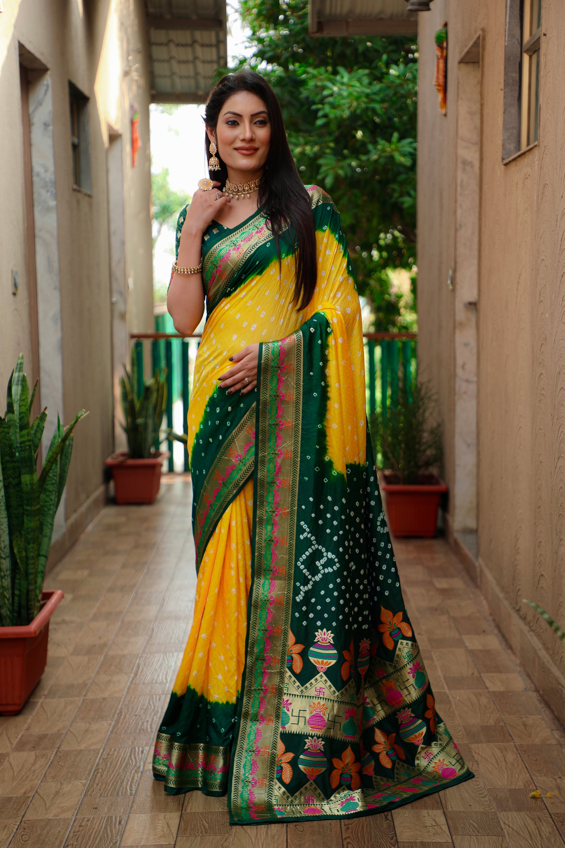 पीली स्वास्तिक बंधेज सिल्क साड़ी मीनाकारी बॉर्डर और ज़री बुनाई कलश और स्वास्तिक डिजाइन के साथ