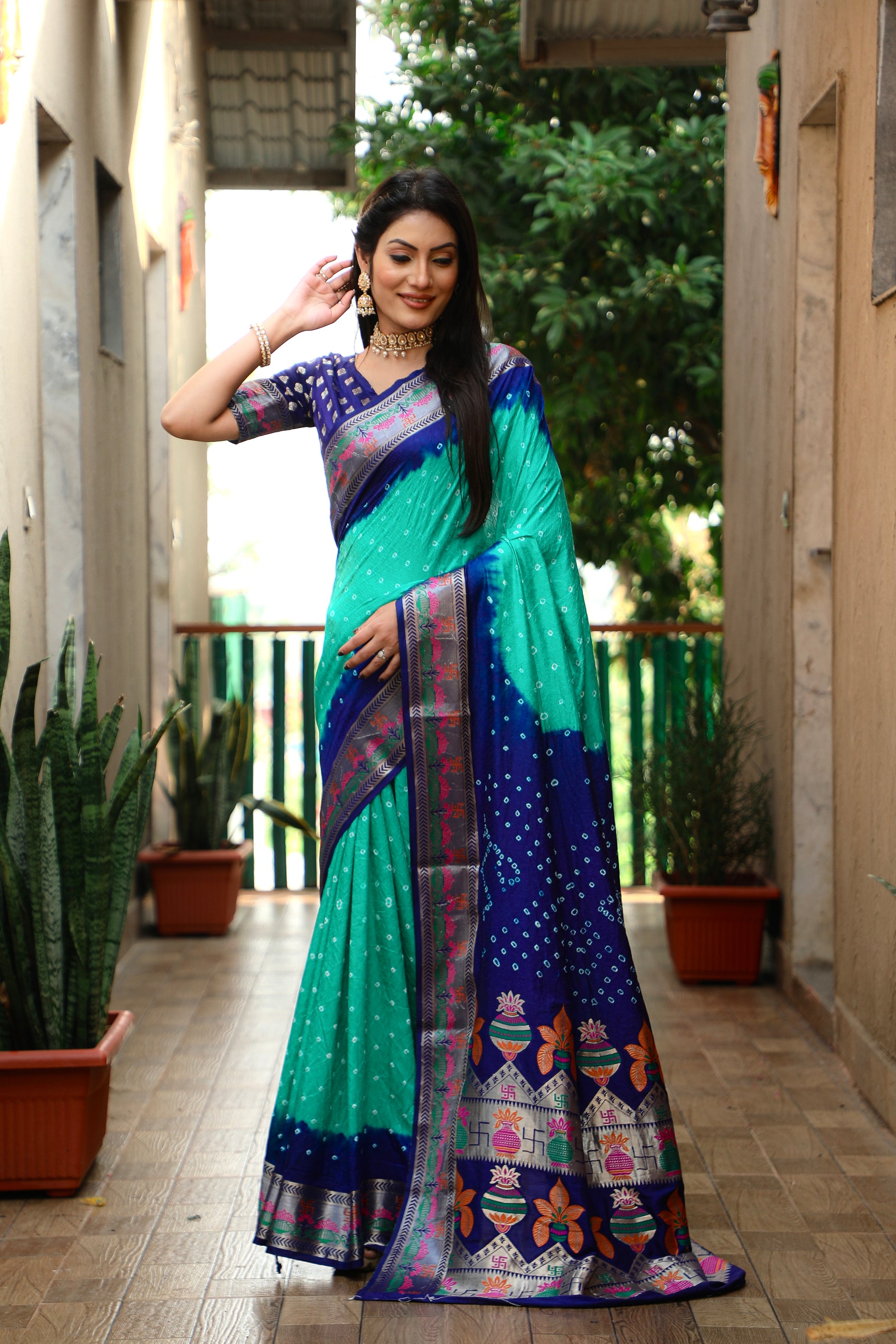 साड़ी का फ़ैब्रिक: बंधेज सिल्क साड़ी मीनाकारी बॉर्डर और ज़री बुनाई कलश और स्वास्तिक डिज़ाइन के साथ