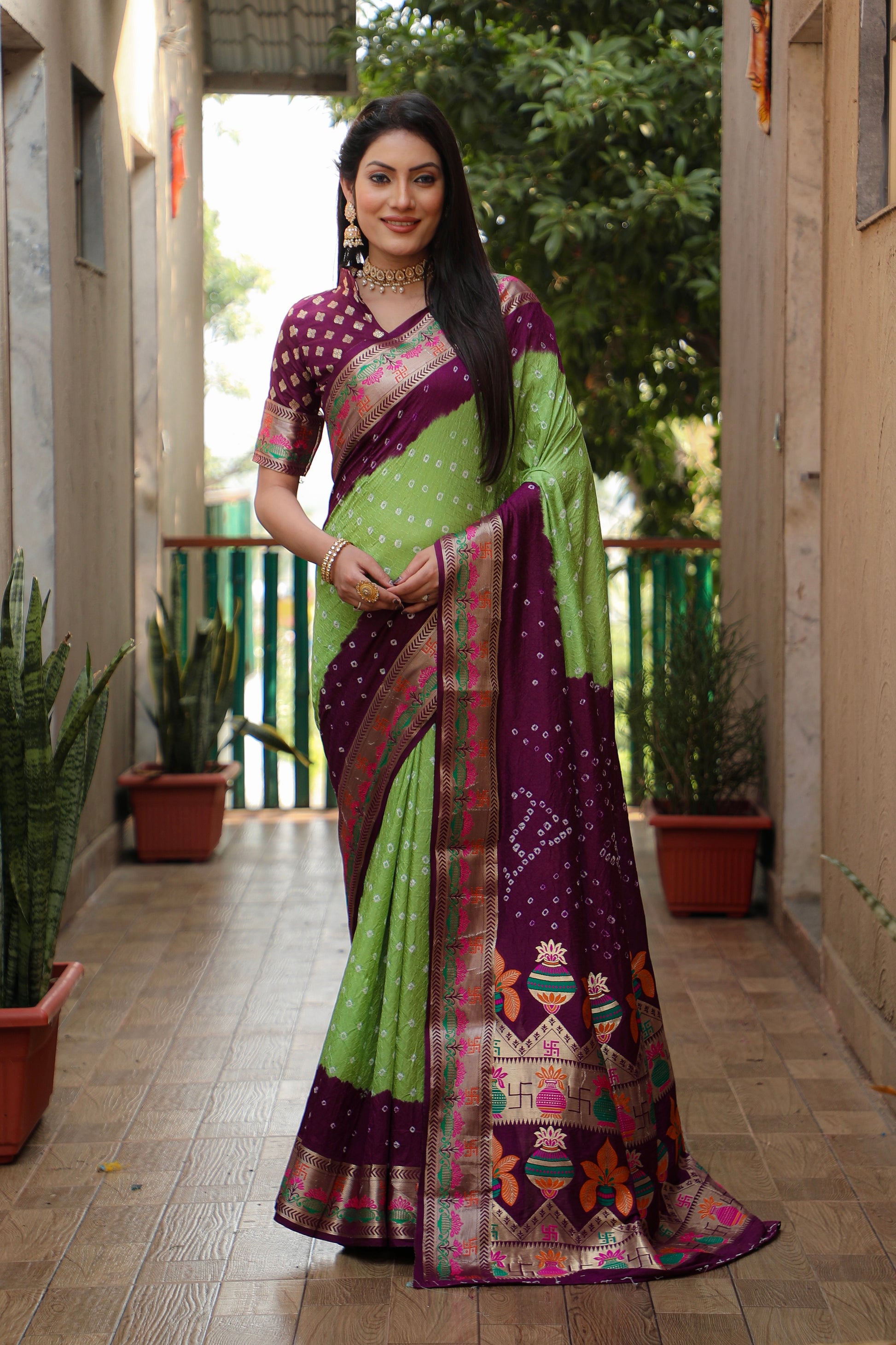 हल्के हरे रंग की स्वास्तिक बंधेज सिल्क साड़ी मीनाकारी बॉर्डर और ज़री बुनाई कलश और स्वास्तिक डिजाइन के साथ