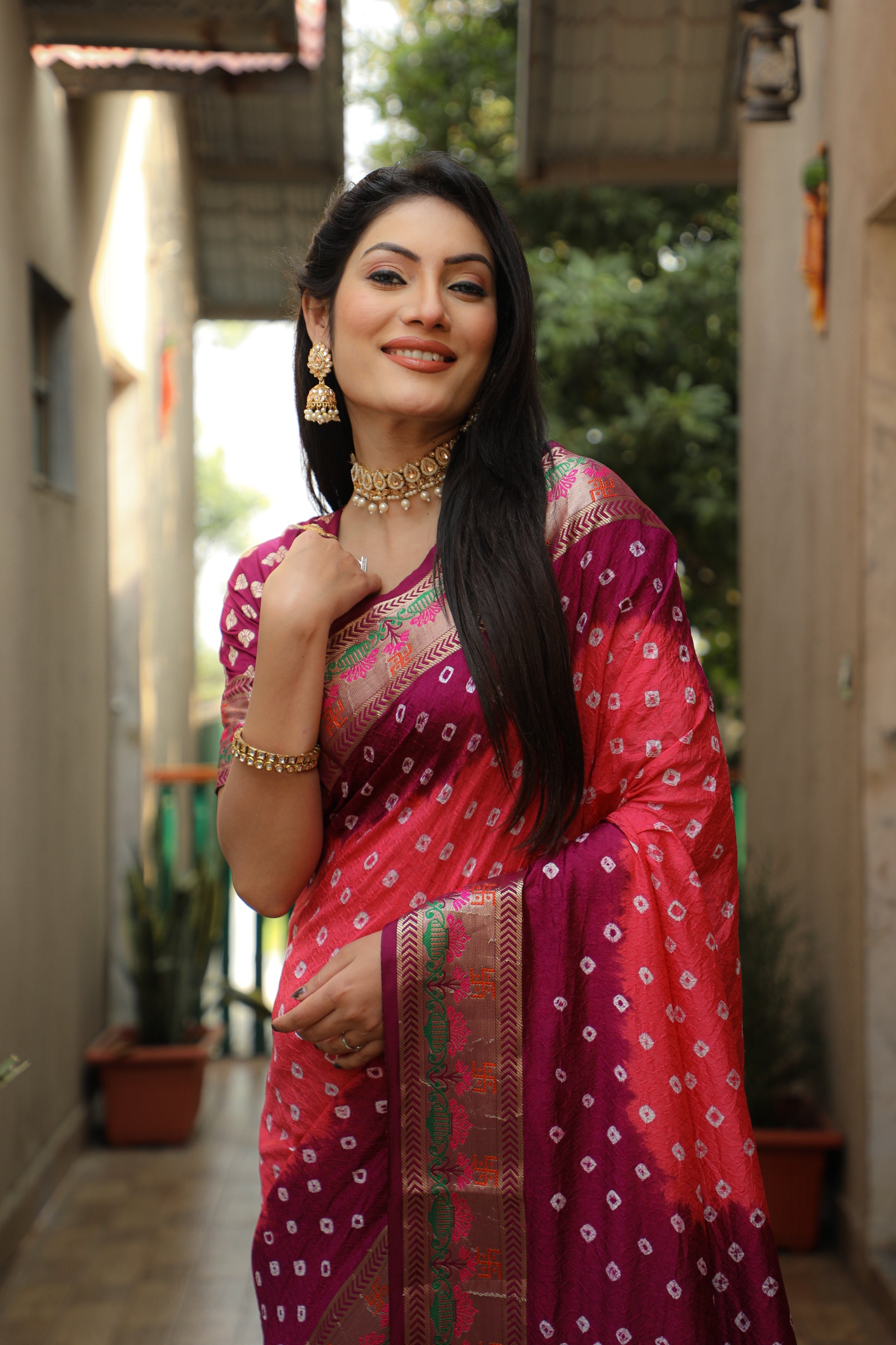 साड़ी का फ़ैब्रिक: बंधेज सिल्क साड़ी मीनाकारी बॉर्डर और ज़री बुनाई कलश और स्वास्तिक डिज़ाइन के साथ