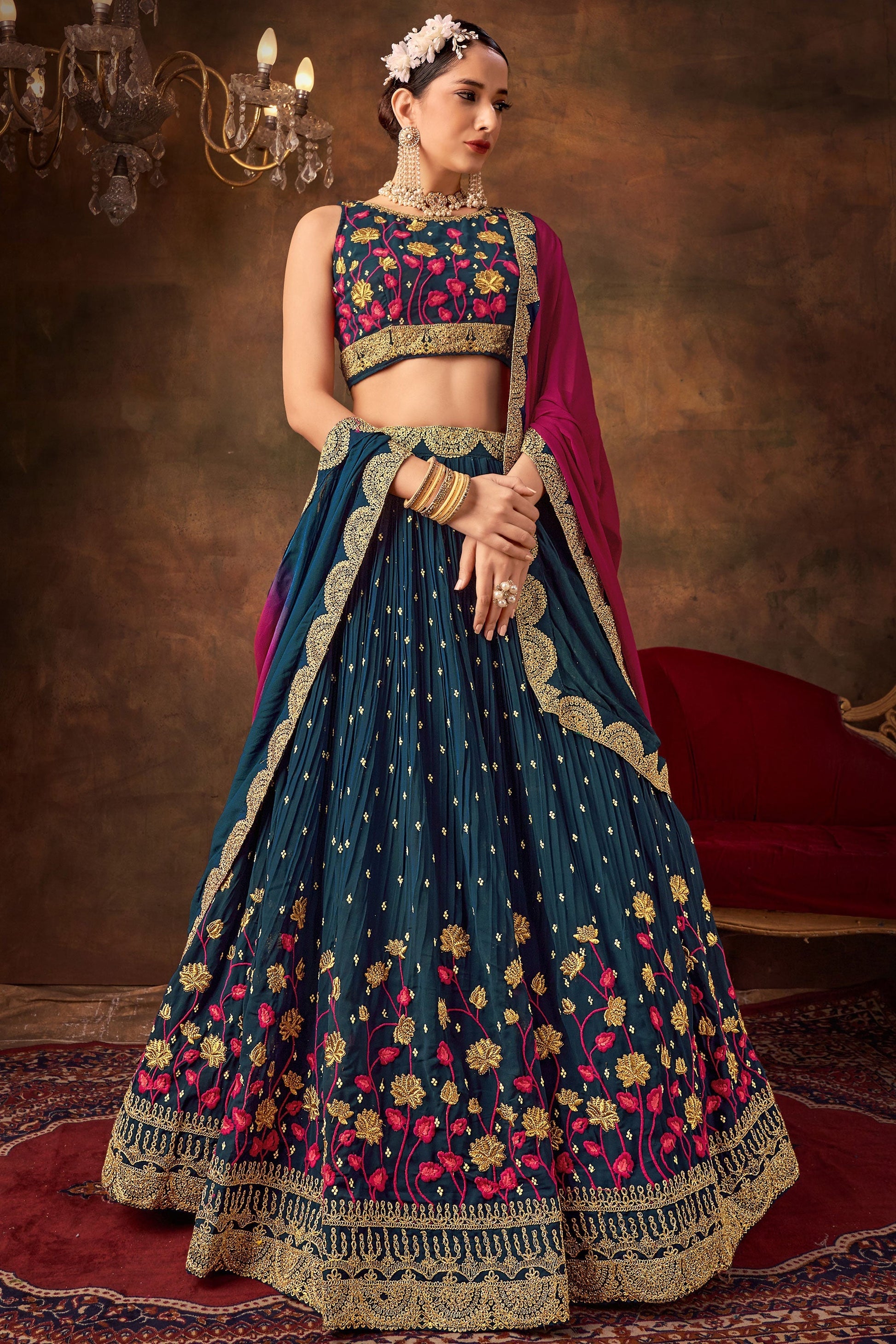 जॉर्जेट फैब्रिक में टील कलर का वेडिंग लहंगा चोली