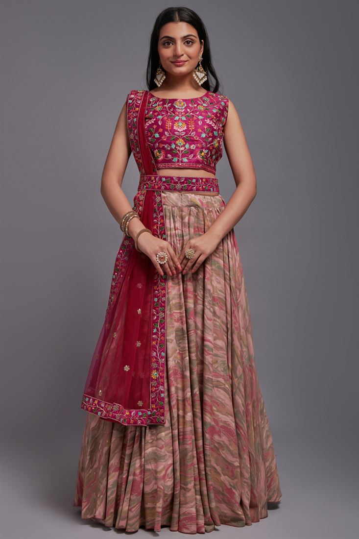 टेक्स्ट ब्लॉक आकर्षक आर्ट सिल्क फैब्रिक गुलाबी रंग का वेडिंग वियर लहंगा चोली कढ़ाई के काम के साथ